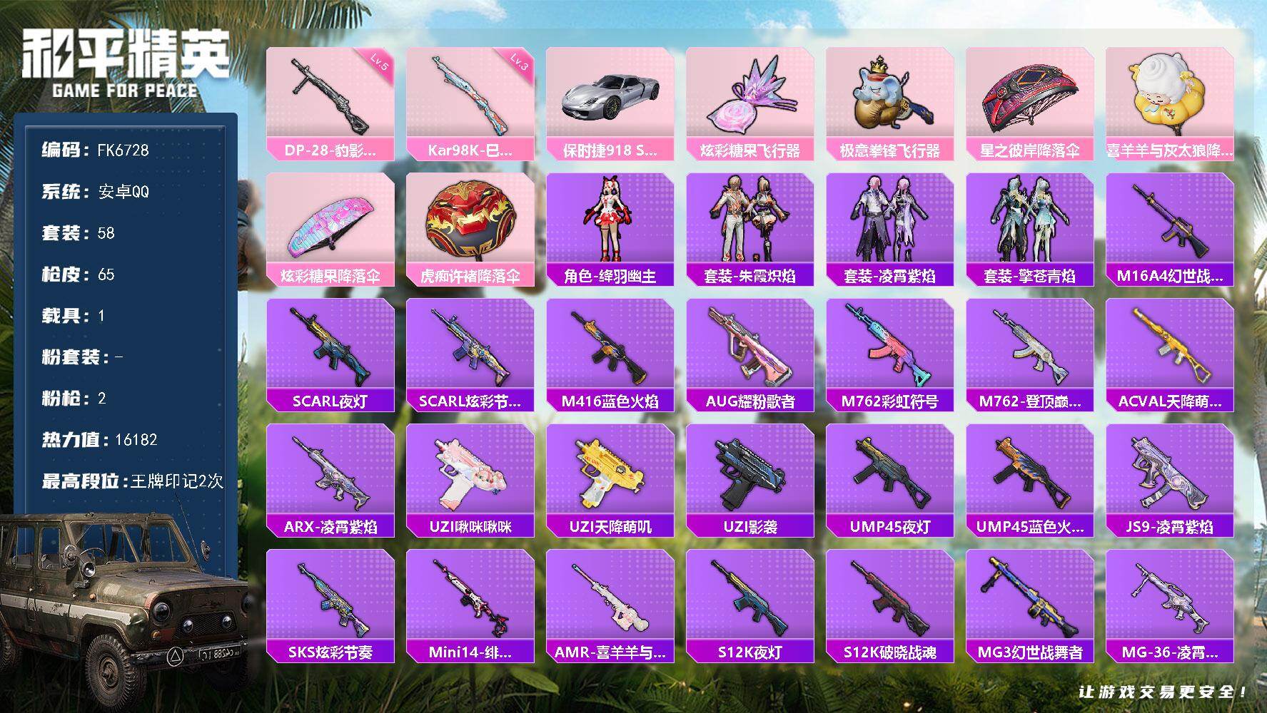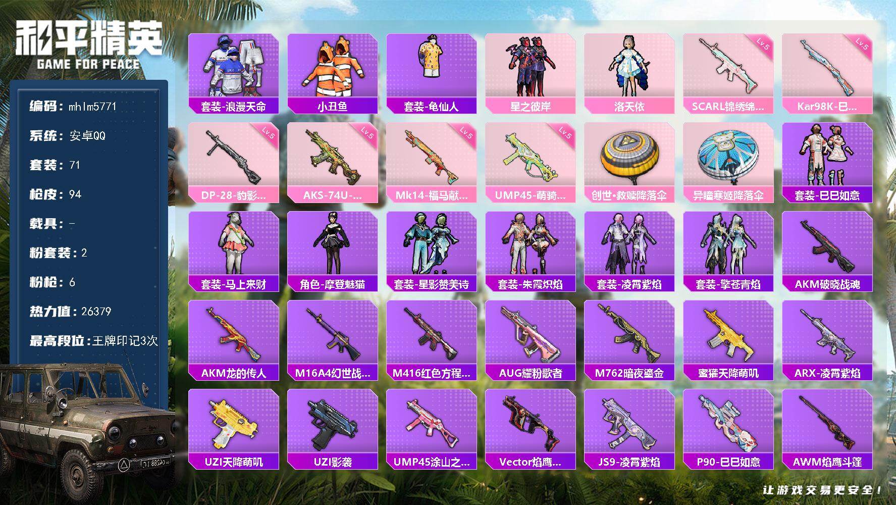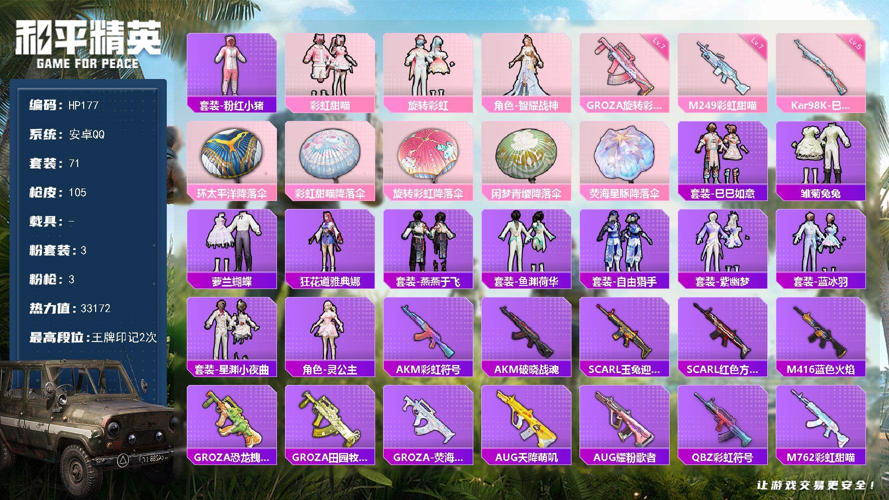【秒换绑】安卓 手Q-3粉装-3特效枪-0载具-0粉色飞行器-33172热力值