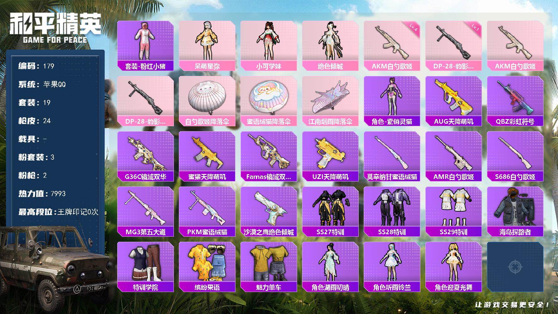 苹果 手Q-3粉装-2特效枪-0载具-0粉色飞行器-7993热力值-0王牌印记