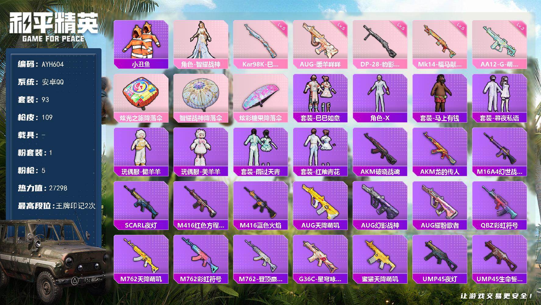 1粉装-5特效枪-0载具-0粉色飞行器-27298热力值-2王牌印记-93套装-109枪皮