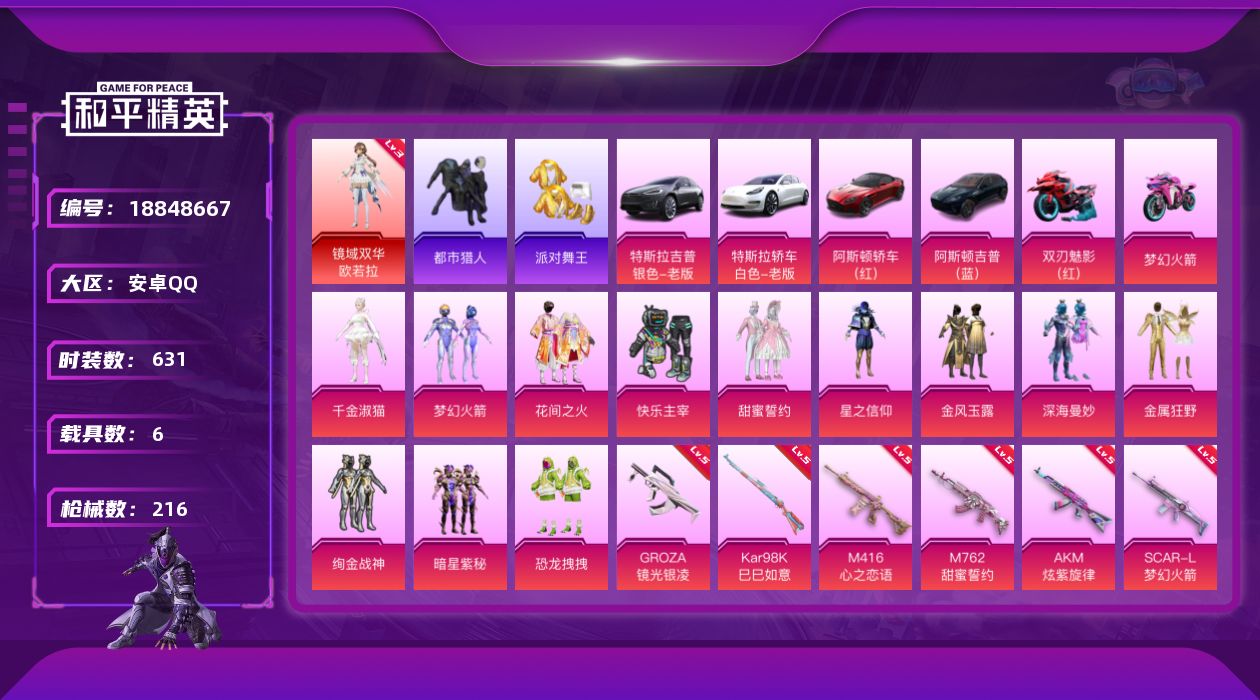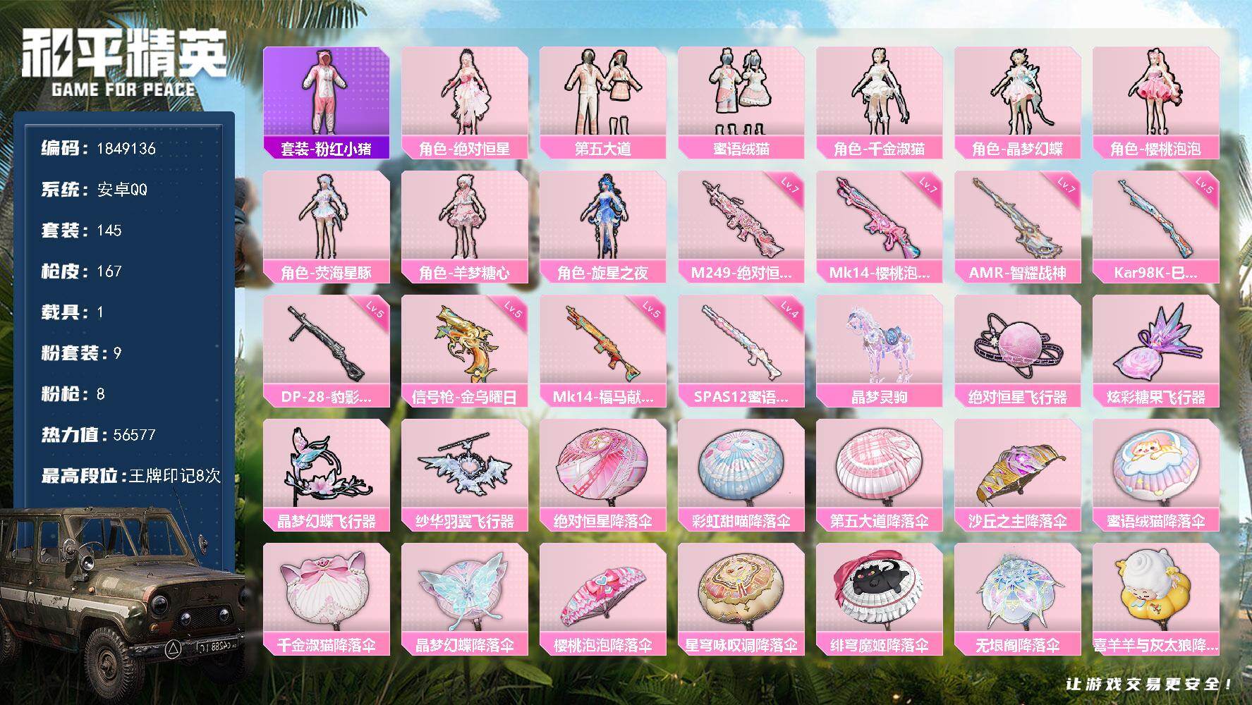 9粉装-8特效枪-1载具-5粉色飞行器-56577热力值-8王牌印记-145套装-167枪皮