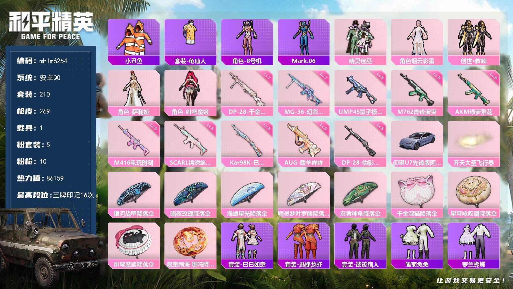 安卓 手Q-5粉装-9特效枪-0载具-6粉色飞行器-59227热力值-9王牌印