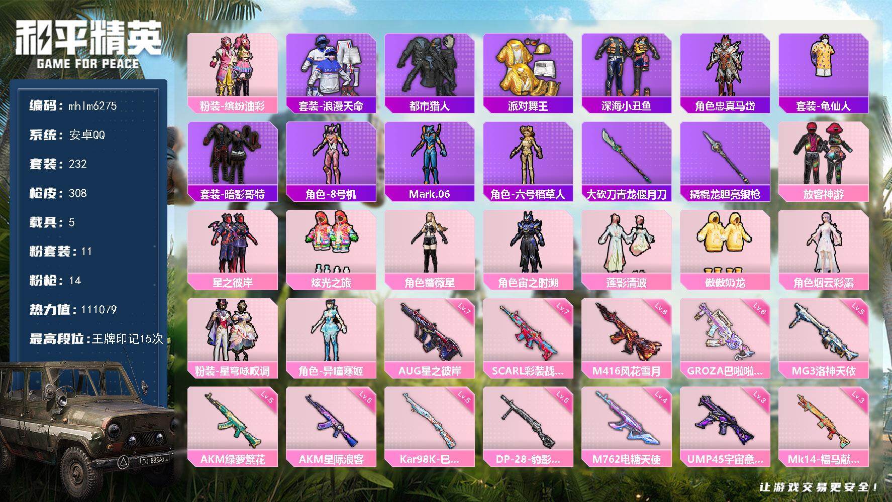 【mhlm6279】安卓 手Q-2神装-26粉装-21特效枪-5载具-14粉色