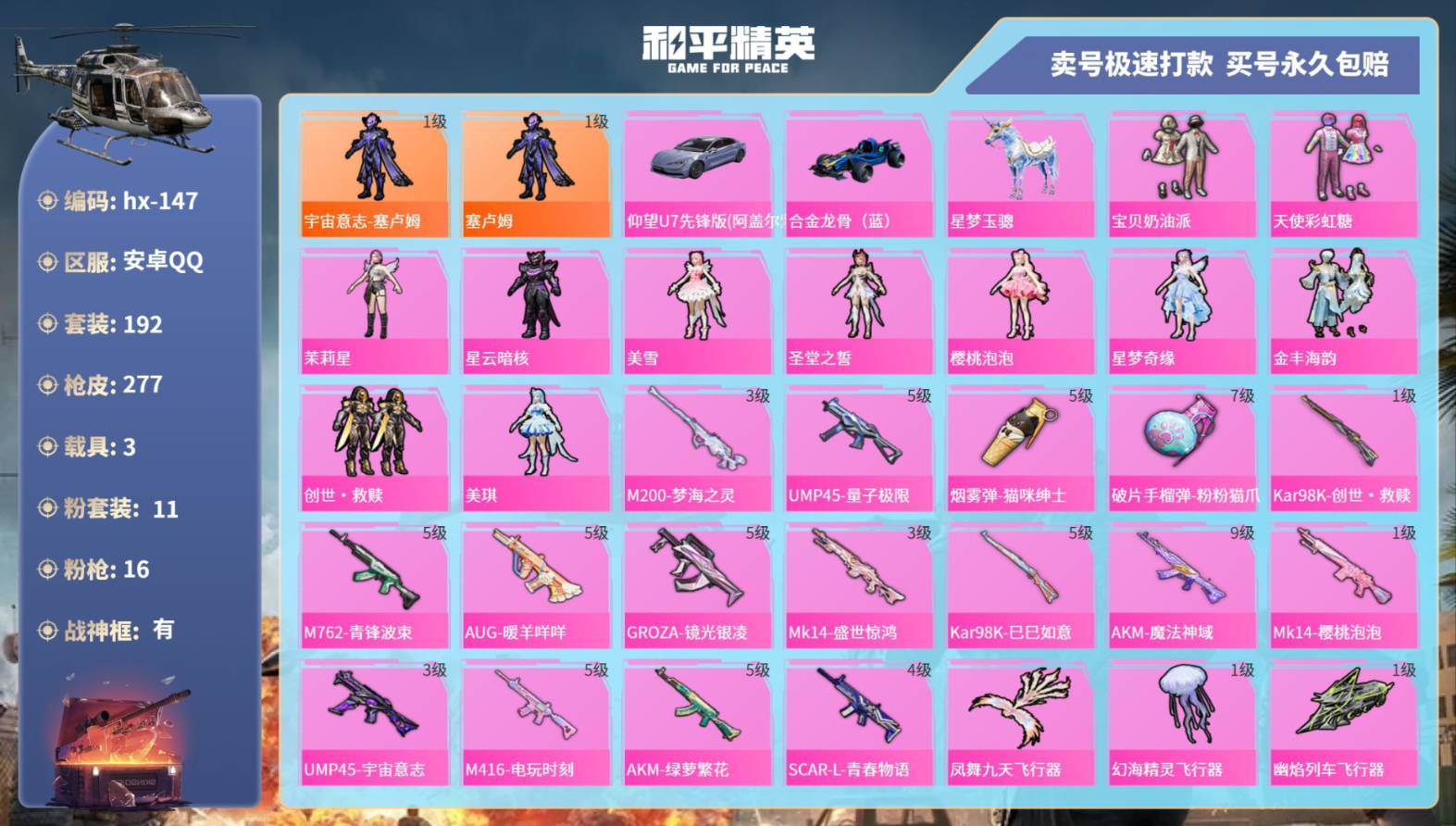 安卓 手Q-3粉装-2特效枪-0载具-0粉色飞行器-18515热力值-2王牌印
