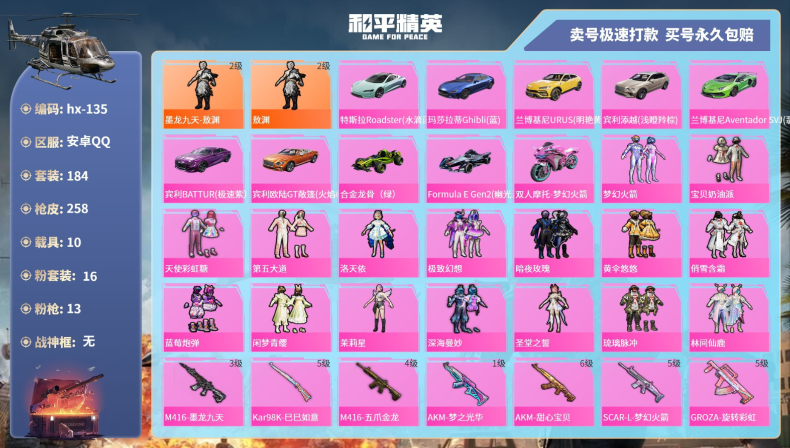 8粉装-11特效枪-4载具-4粉色飞行器-95987热力值-18王牌印记-220套装-308枪皮