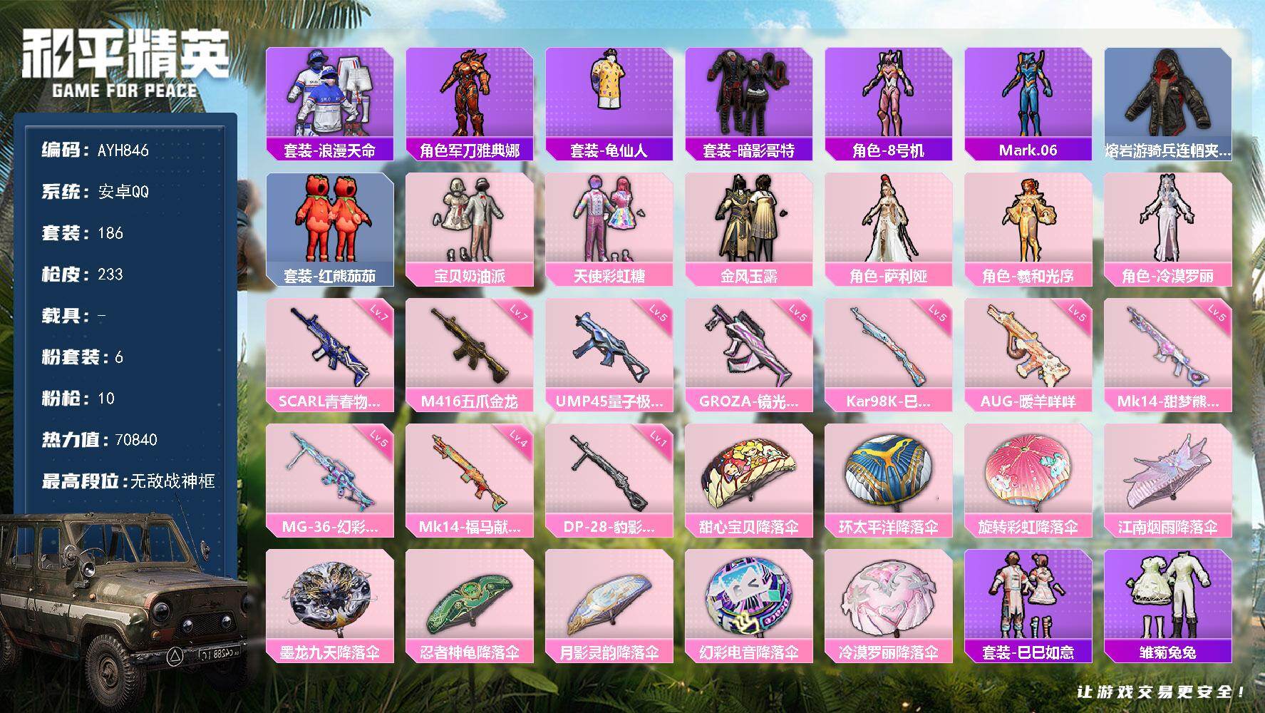 【女号梦幻17粉装12特效枪2载具 可秒换绑不用等】 安卓