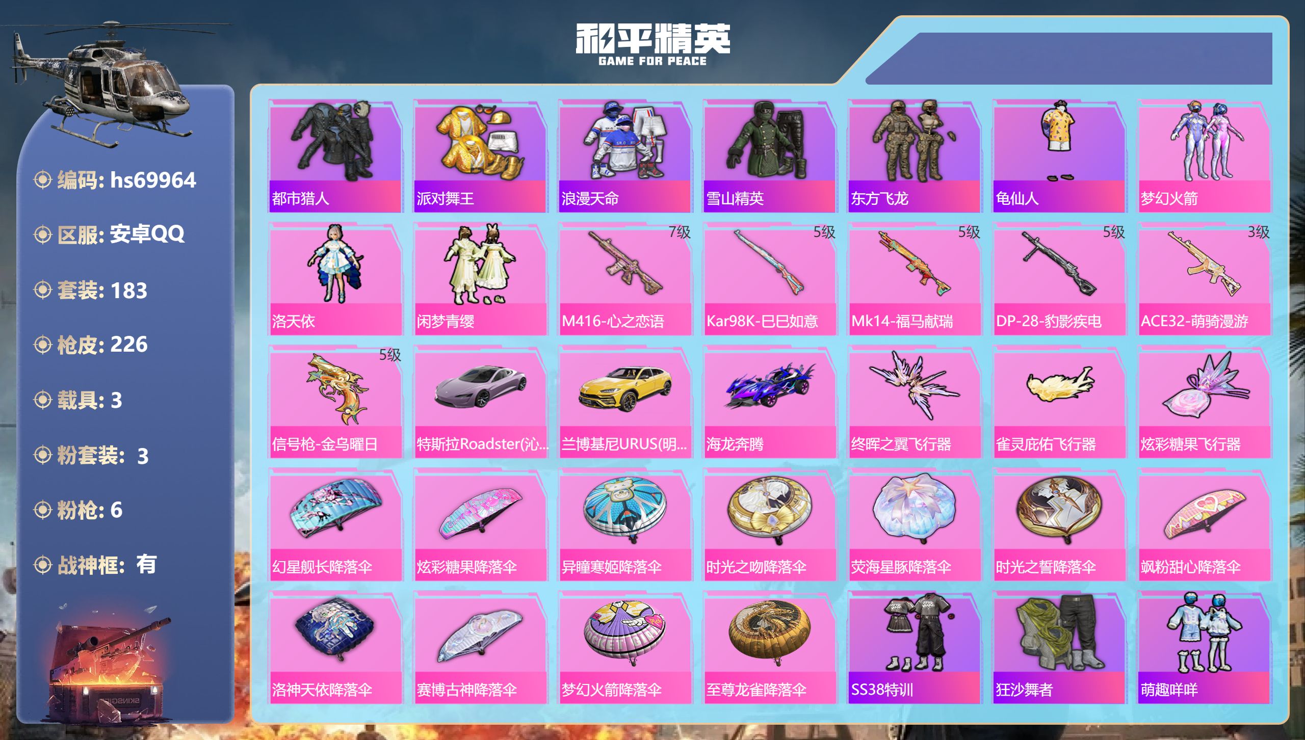 27王牌印记-有战神框-3粉装-6特效枪-3载具-74236热力值-183套装-226枪皮-4卓越印记
