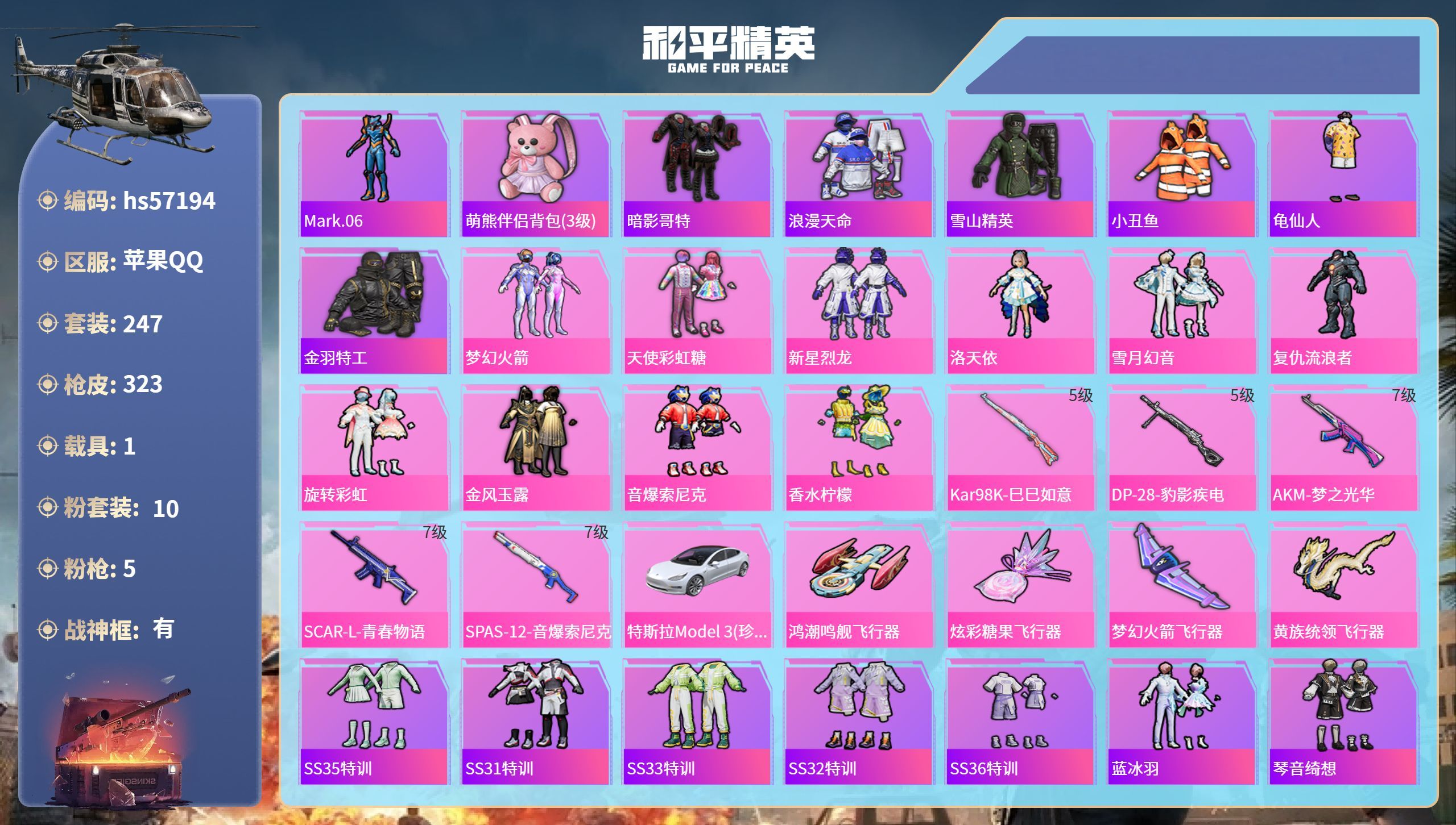 hs57232苹果手Q-15王牌印记-6粉装-6特效枪-2载具-65025热力值-125套装-194