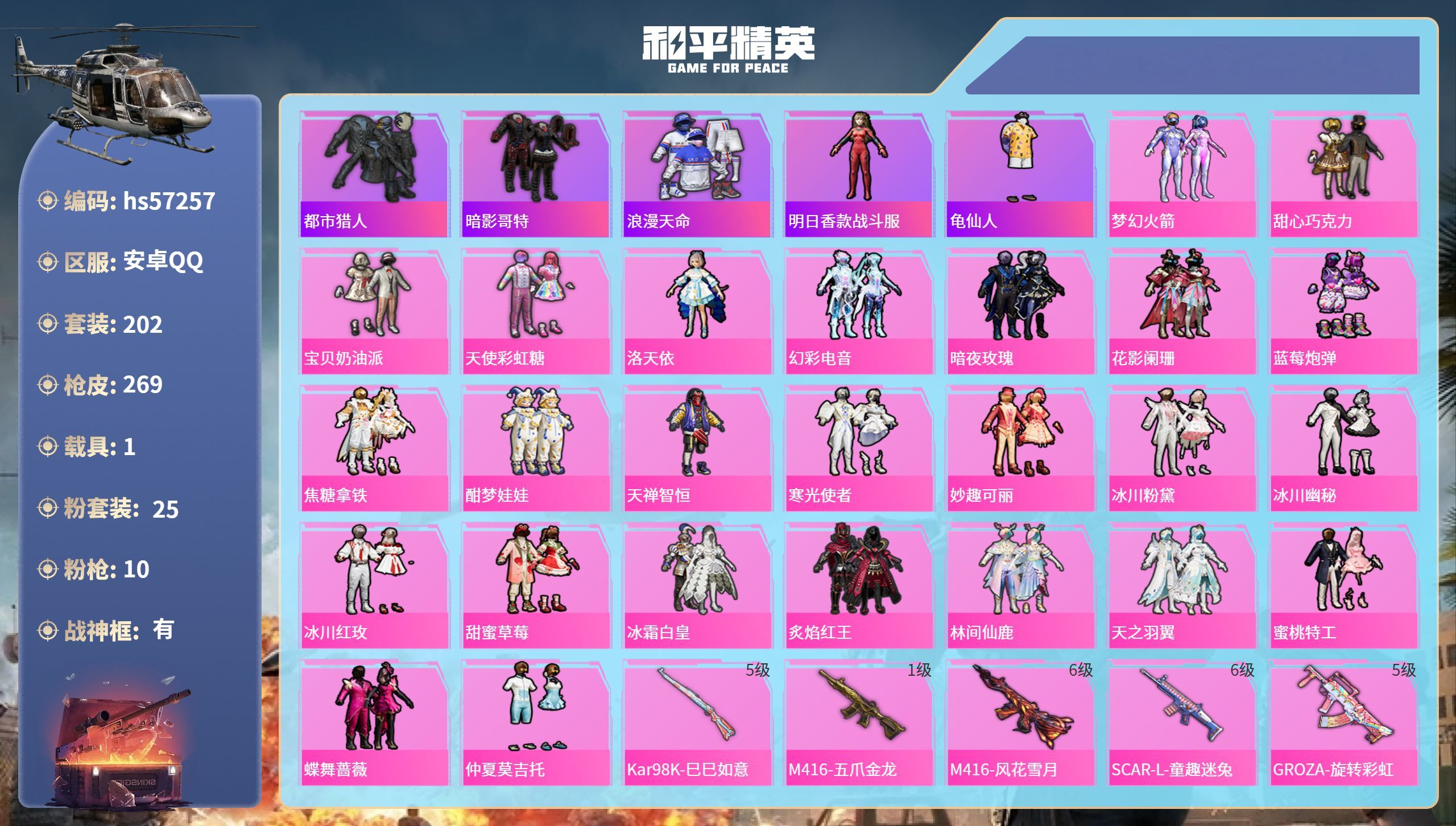 hs57257 安卓手Q-14王牌印记-有战神框-25粉装-10特效枪-1载具-94951热力值-2