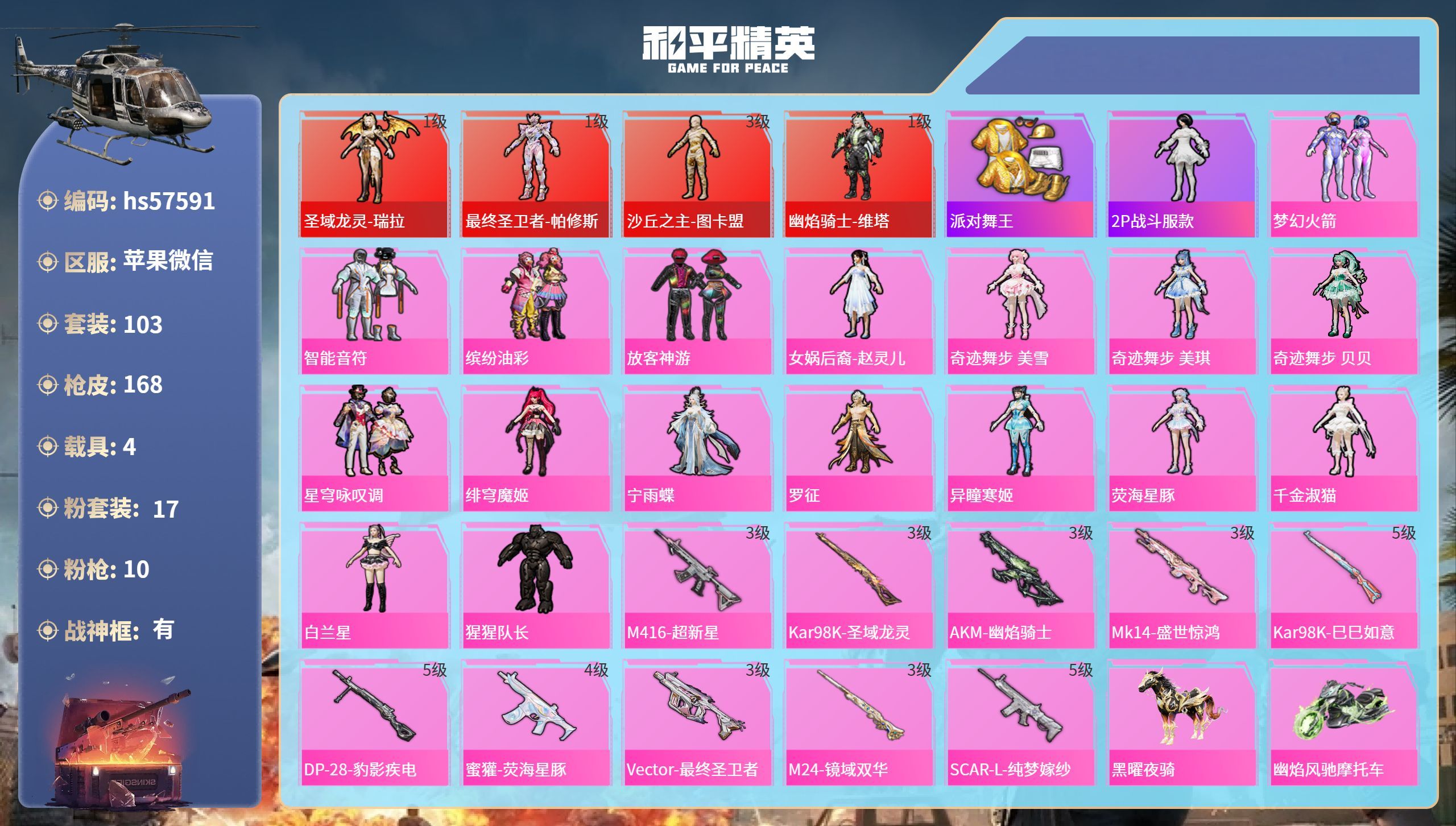 hs57580 苹果v-4王牌印记-10粉装-9特效枪-10载具-51864热力值-73套装-11