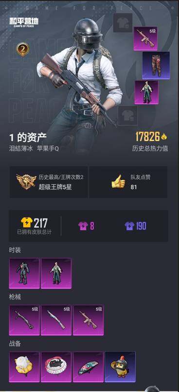 和平精英【苹果QQ】2粉装-3特效枪-17826热力值-2王牌印记-41套装-62枪皮