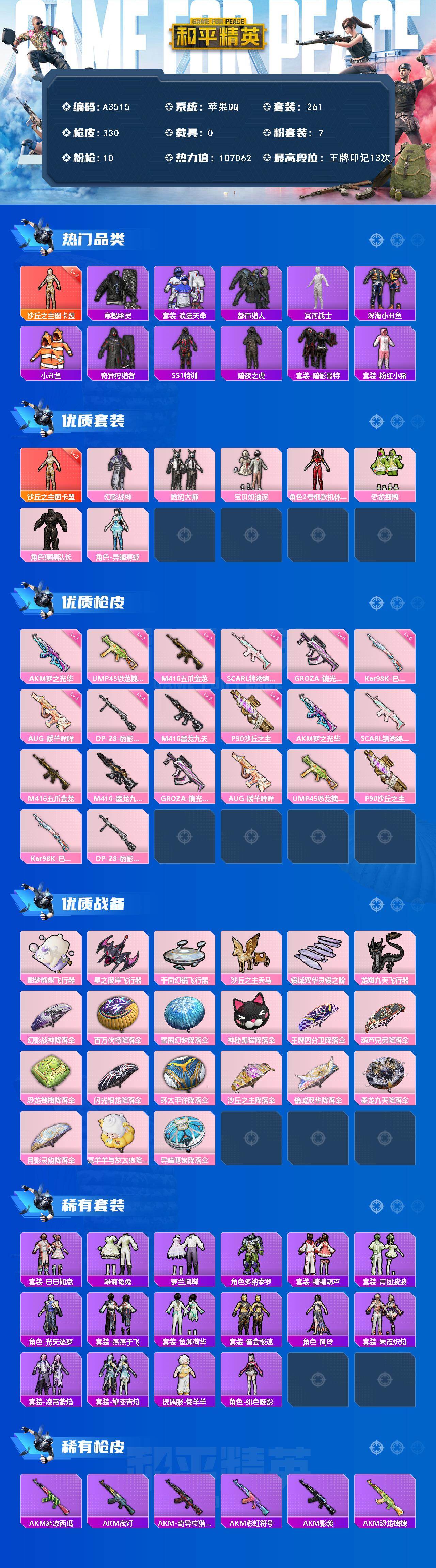 1神装-7粉装-10特效枪-0载具-7粉色飞行器-107062热力值-13王牌印记-261套装-330枪皮