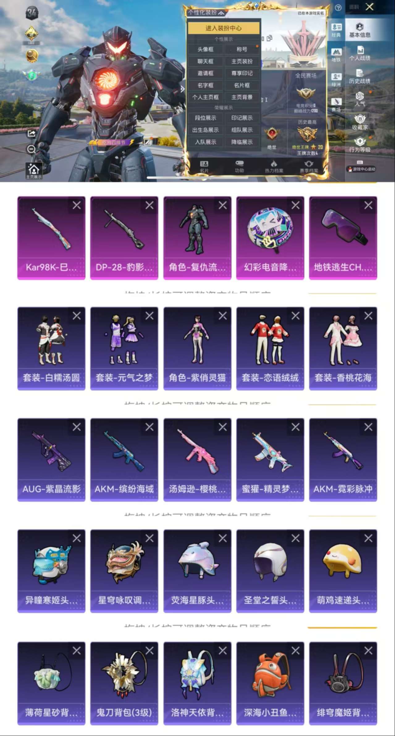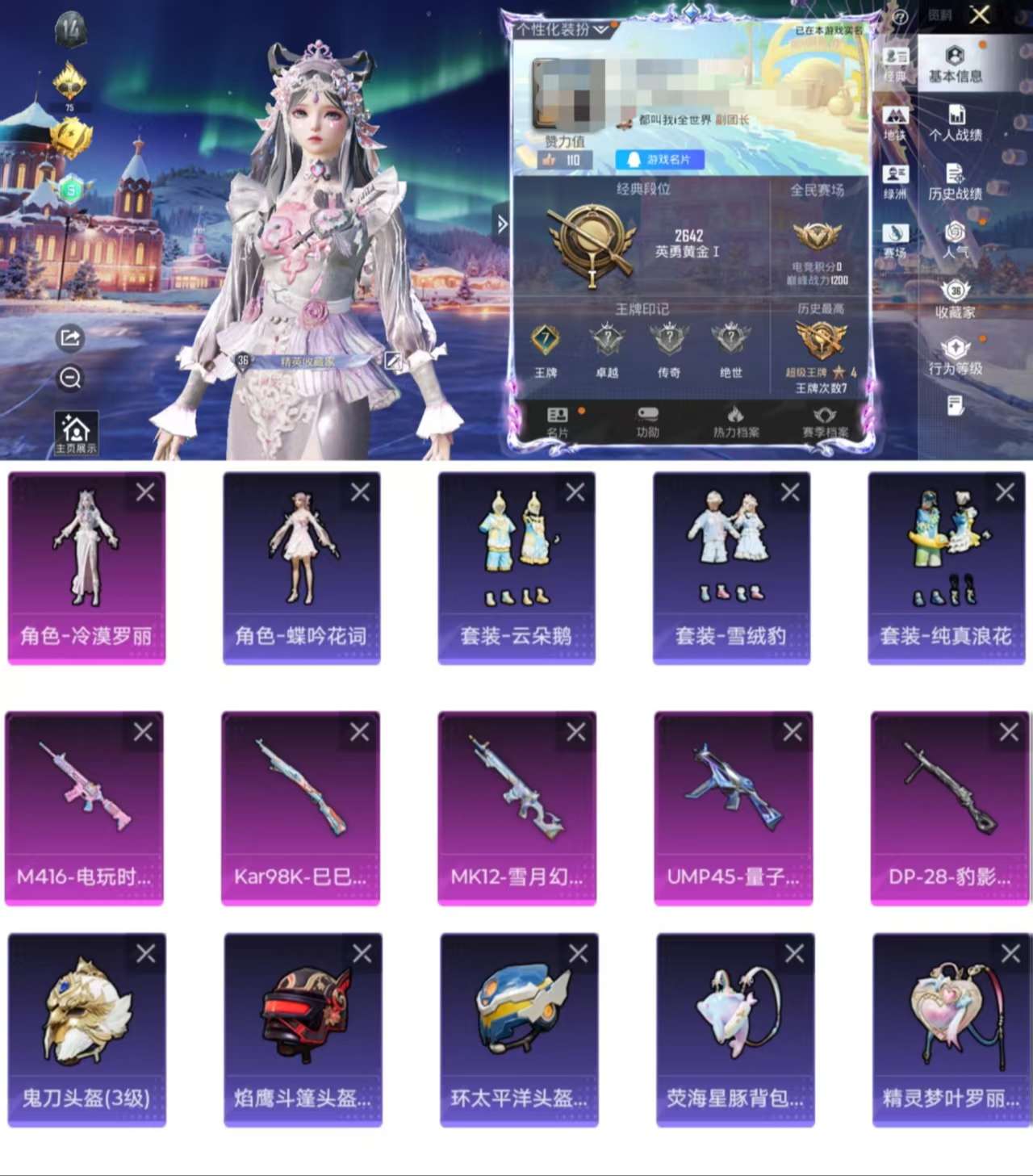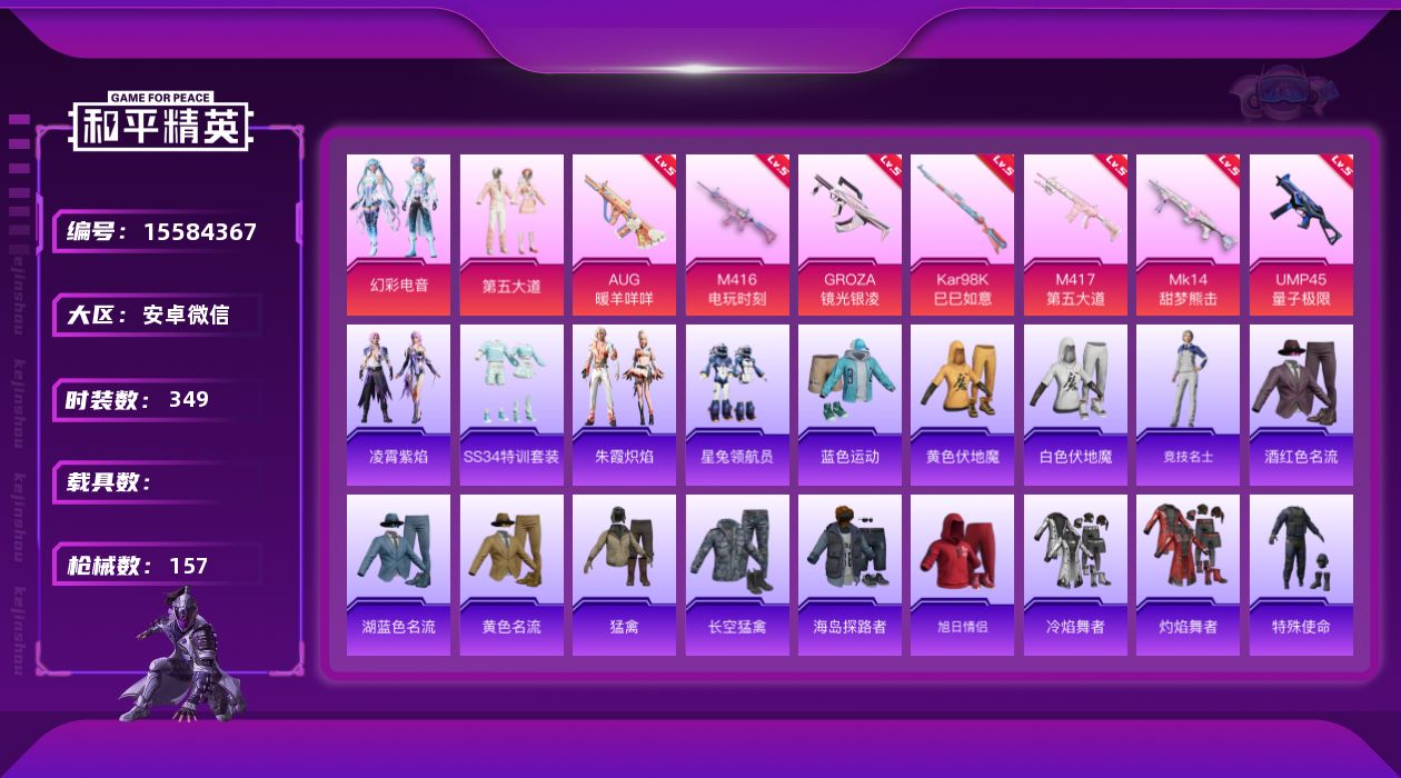 无敌战神框-2神装-26粉装-15特效枪-7载具-12粉色飞行器-118205热力值-9王牌印记-228套装-270枪皮