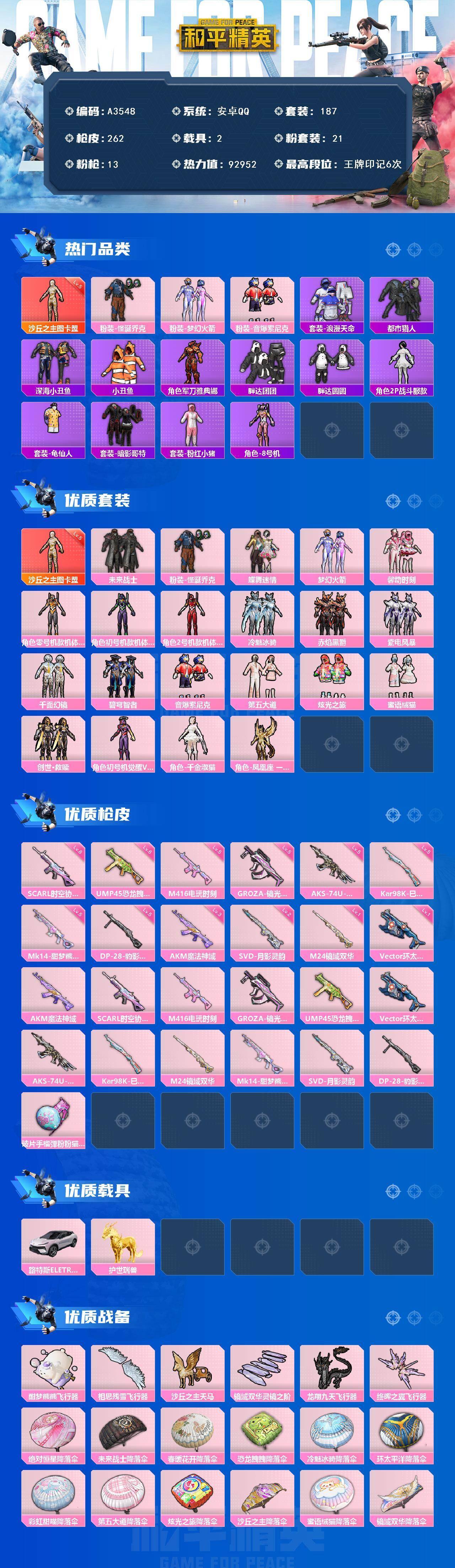 安卓 手Q-9粉装-6特效枪-1载具-5粉色飞行器-89563热力值-12王牌