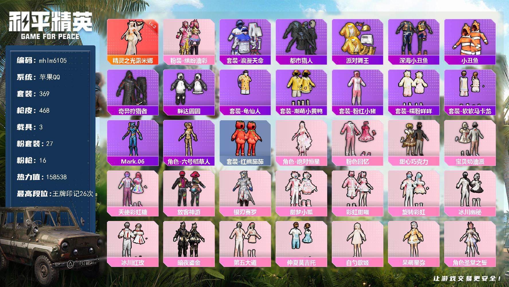 【mhlm6105】苹果 手Q-1神装-27粉装-16特效枪-3载具-8粉色飞