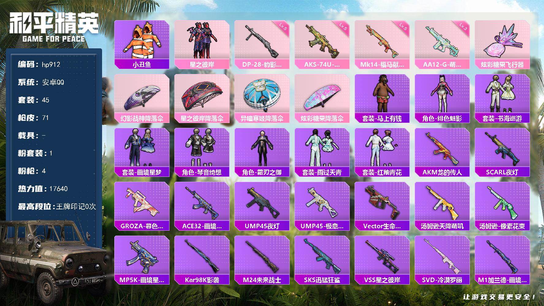 安卓 手Q-5粉装-11特效枪-1载具-2粉色飞行器-55912热力值-9王牌
