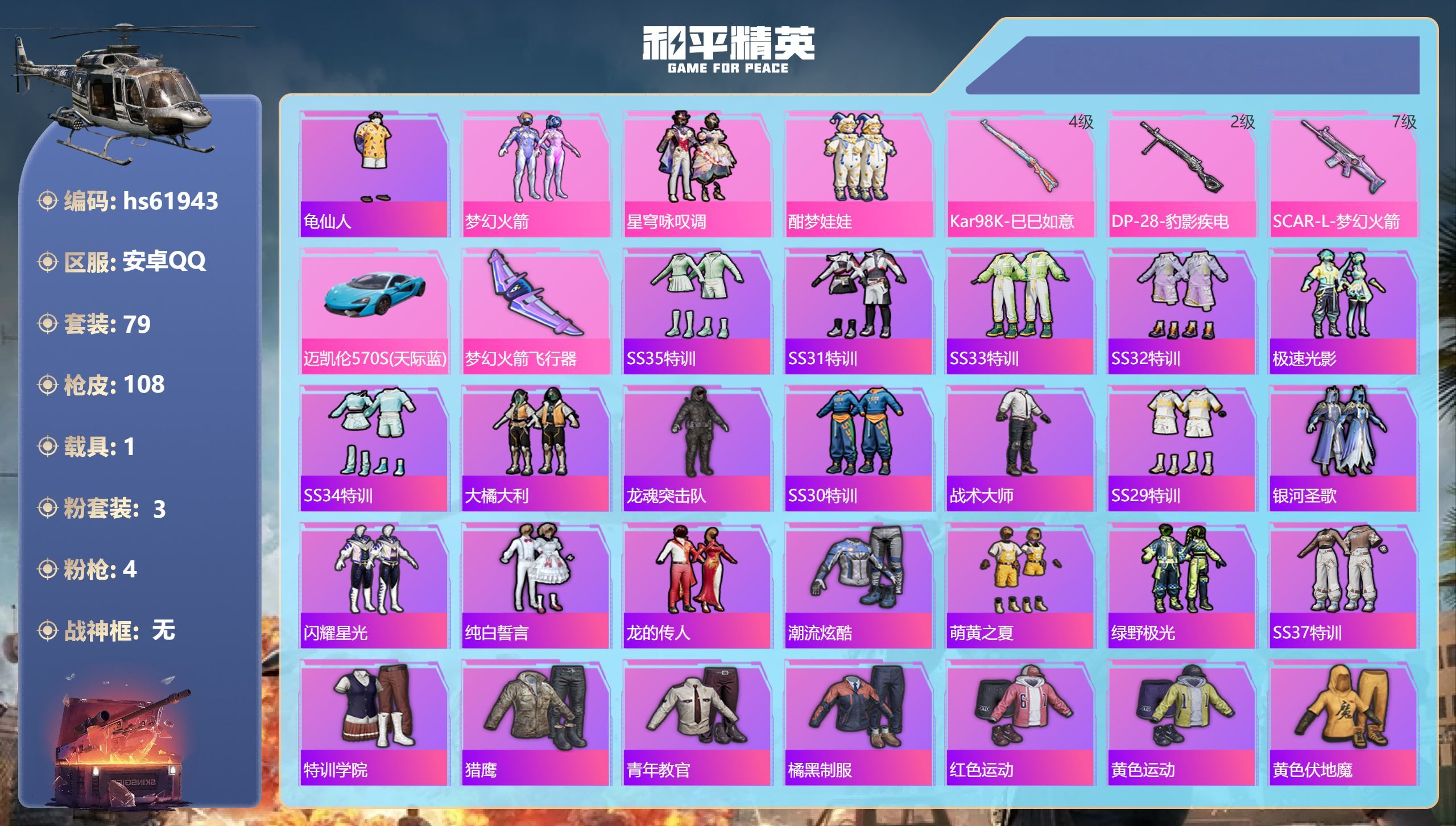hs61943 安卓手Q-2王牌印记-3粉装-4特效枪-1载具-30082热力值-79套装-108枪