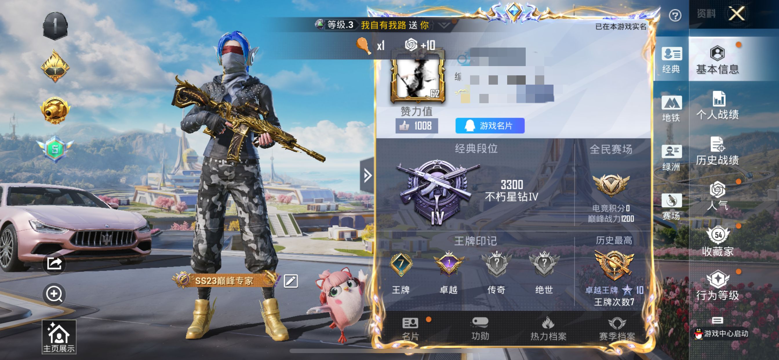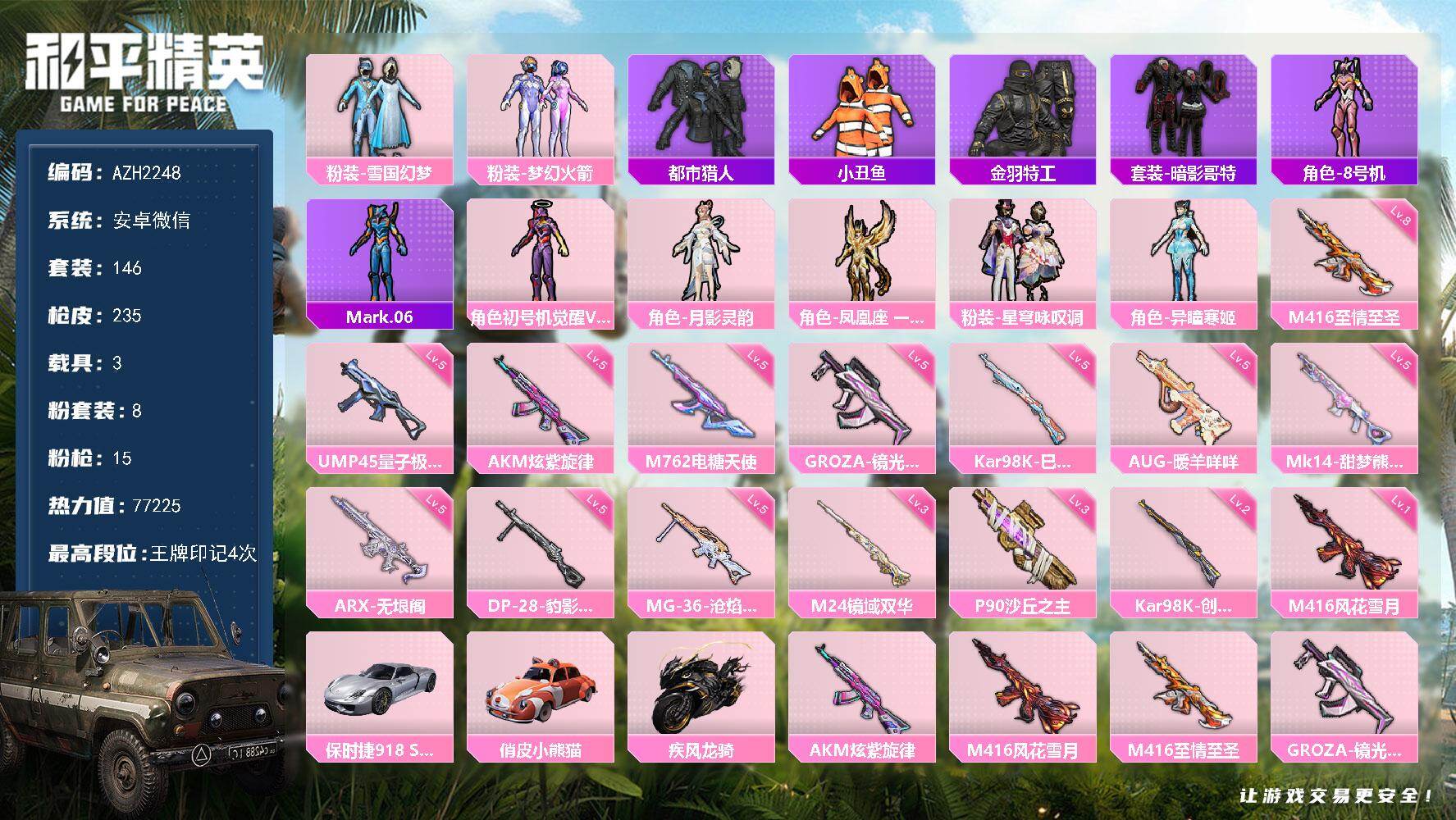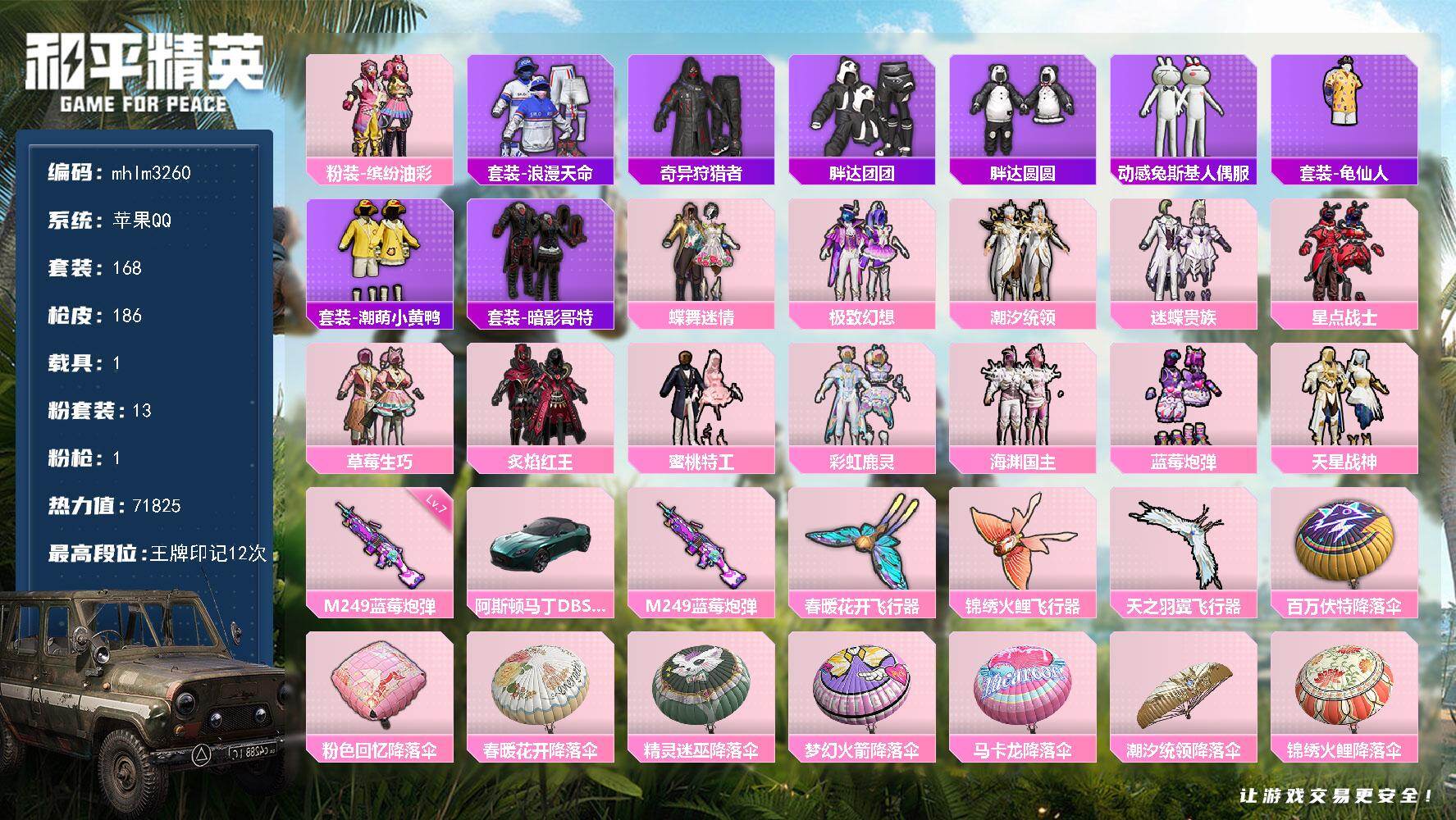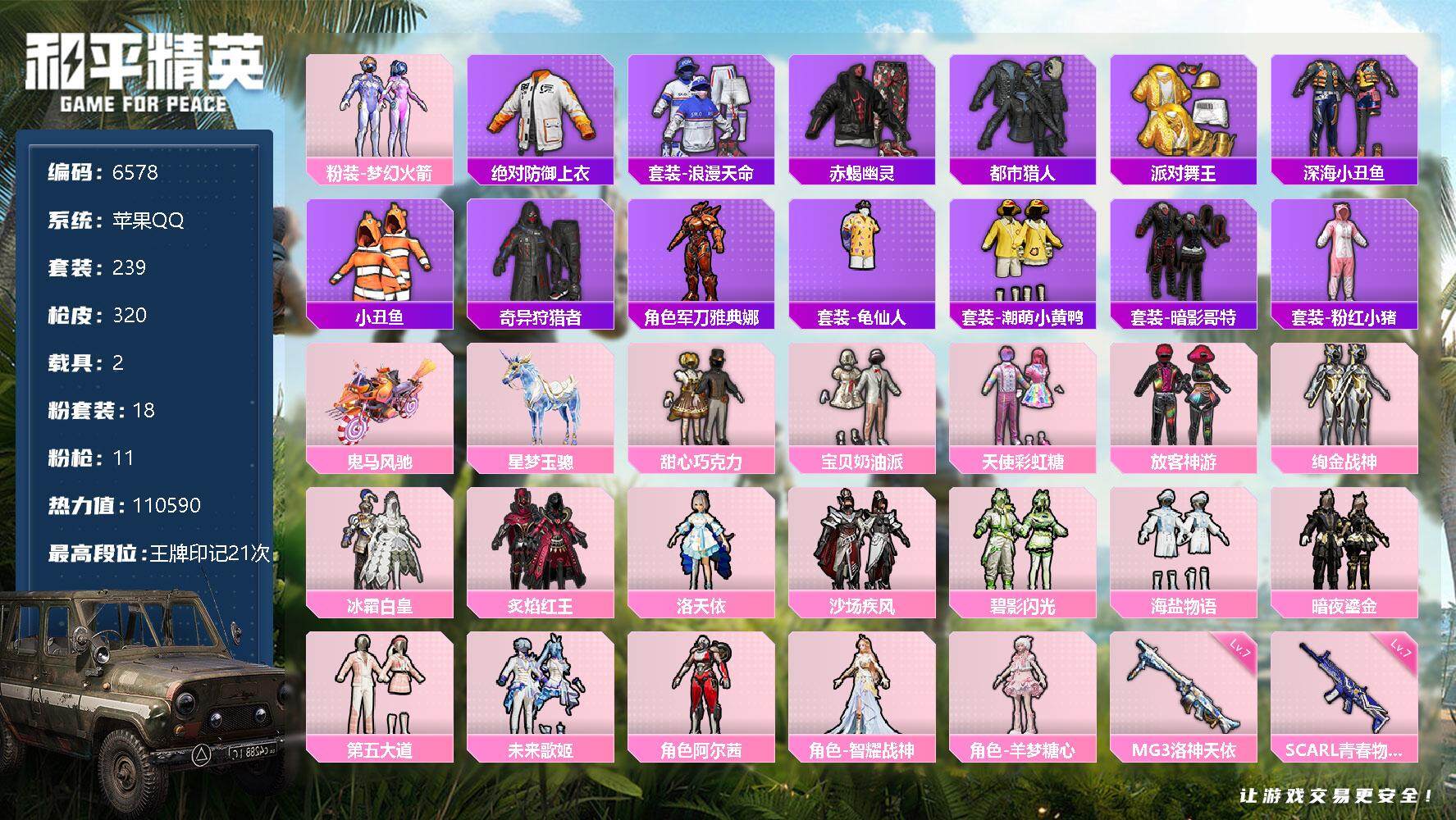a4218/苹果v/热力值:62069,2神装,8粉装,9粉枪,4载具,26粉色战备,109套装,