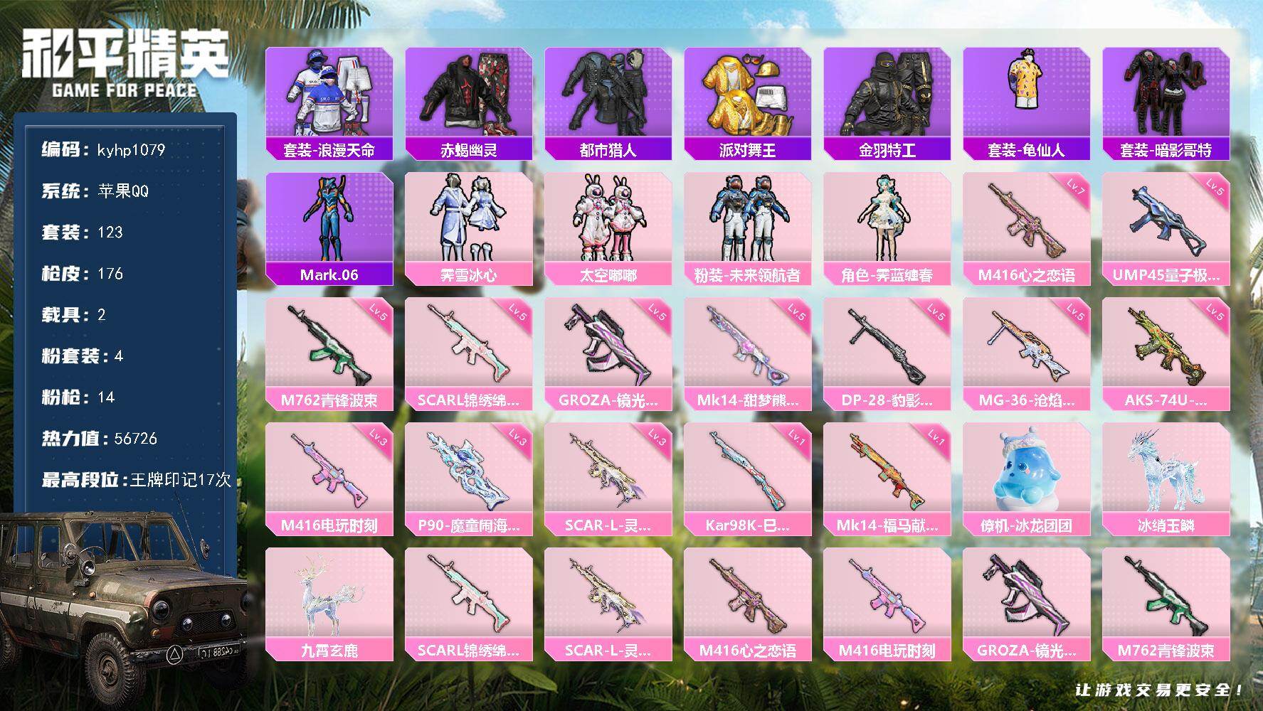 苹果 手Q-4粉装-14特效枪-2载具-5粉色飞行器-56726热力值-17王