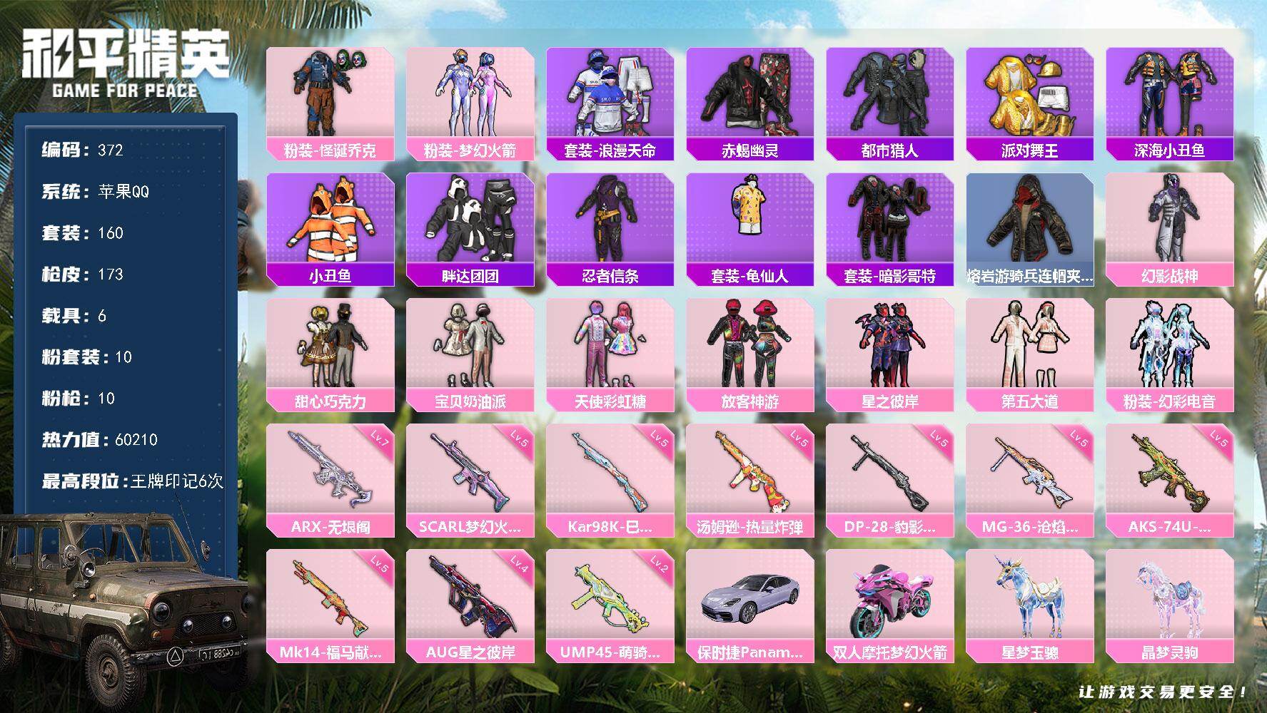 苹果 手Q-6粉装-6特效枪-1载具-2粉色飞行器-61954热力值-10王牌