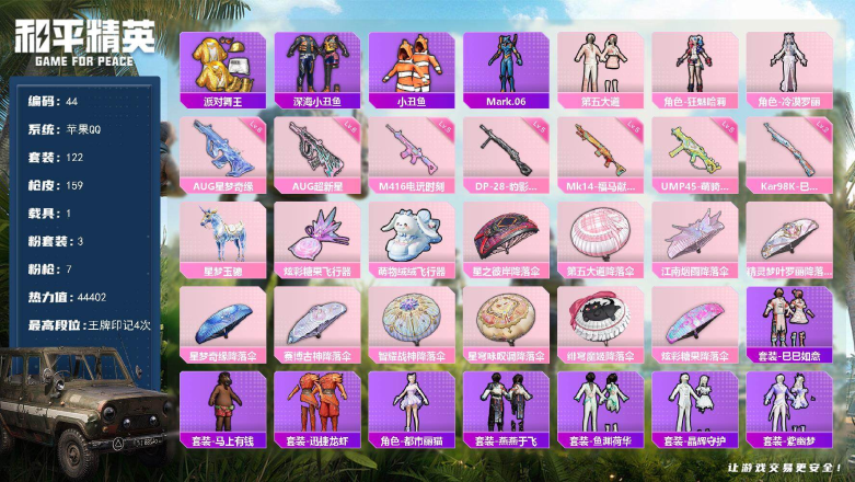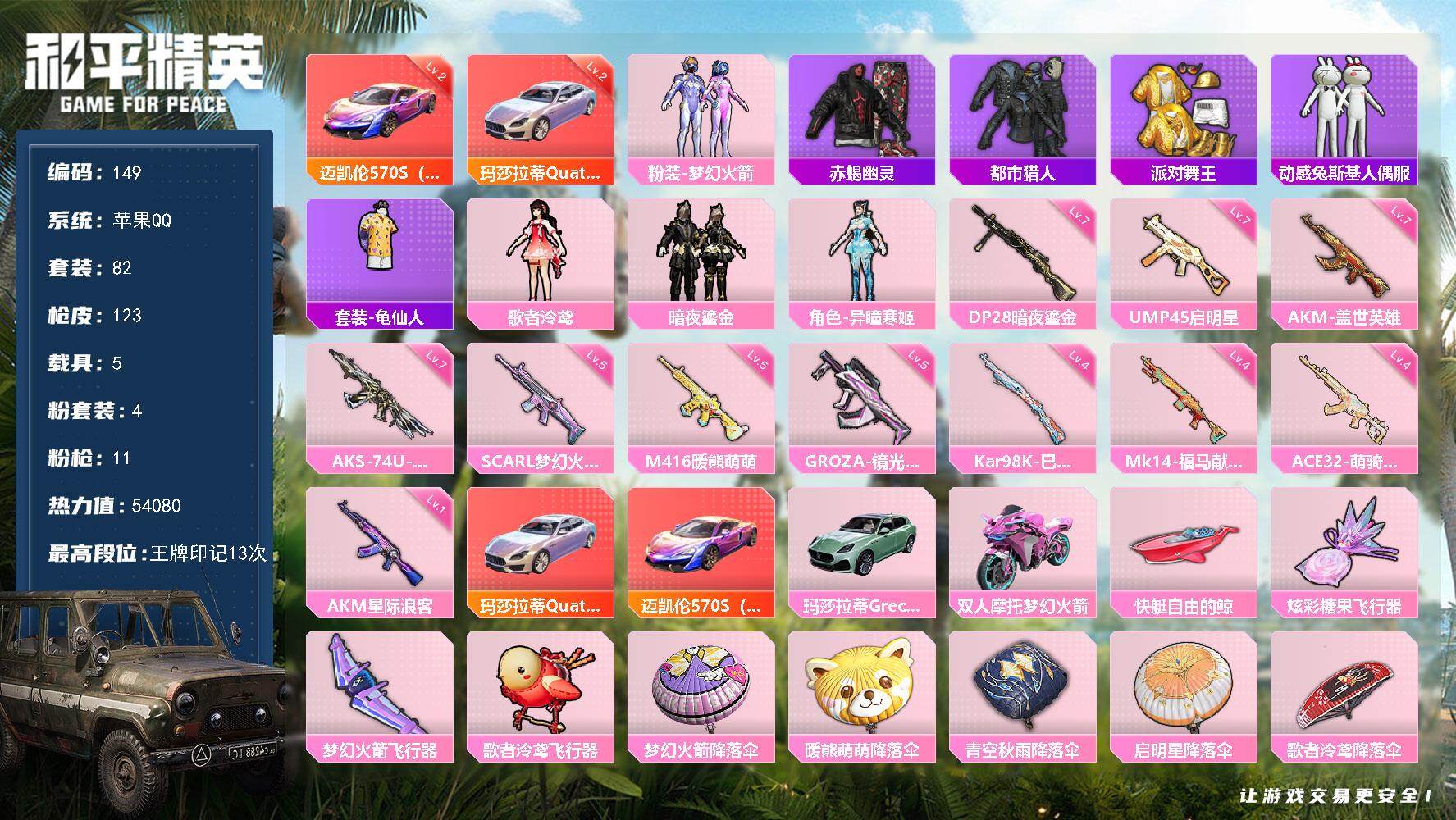 A1640苹果 手Q-1神装-2粉装-9特效枪-1载具-6粉色飞行器-4817