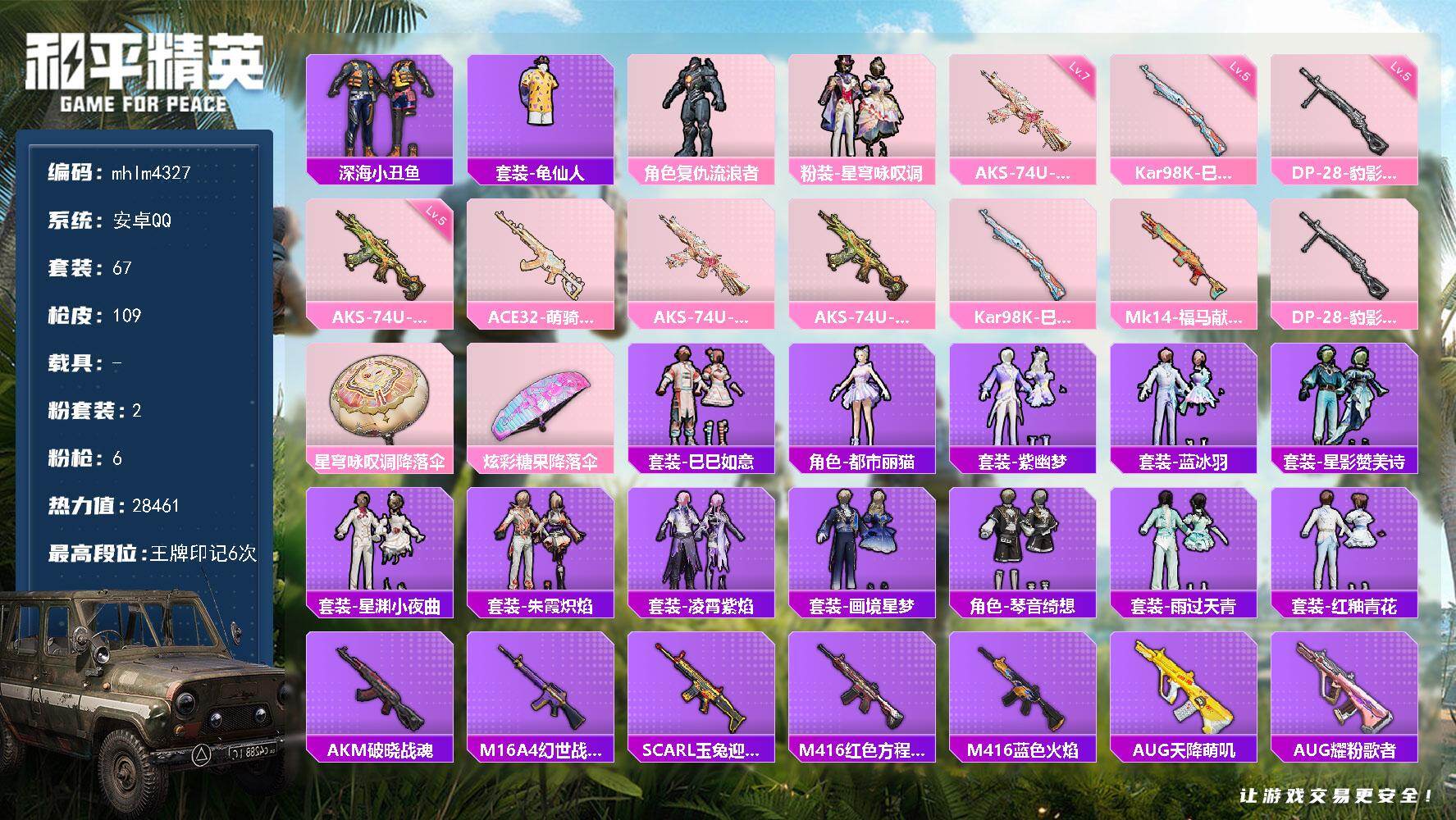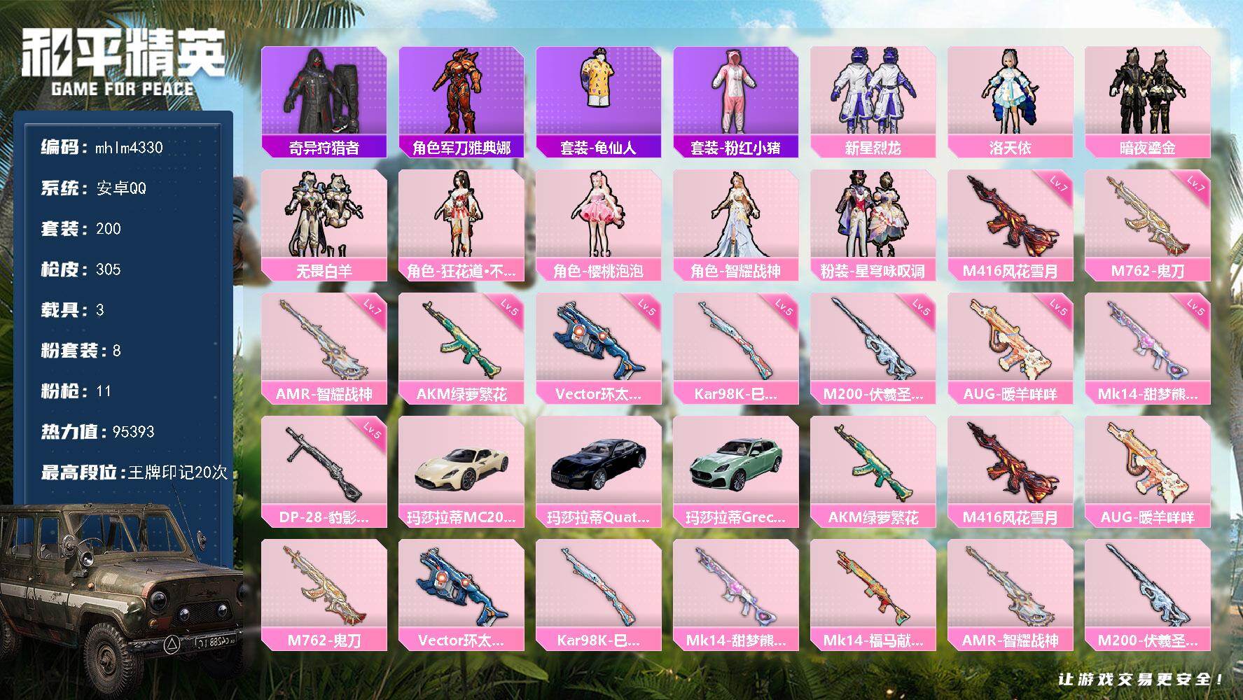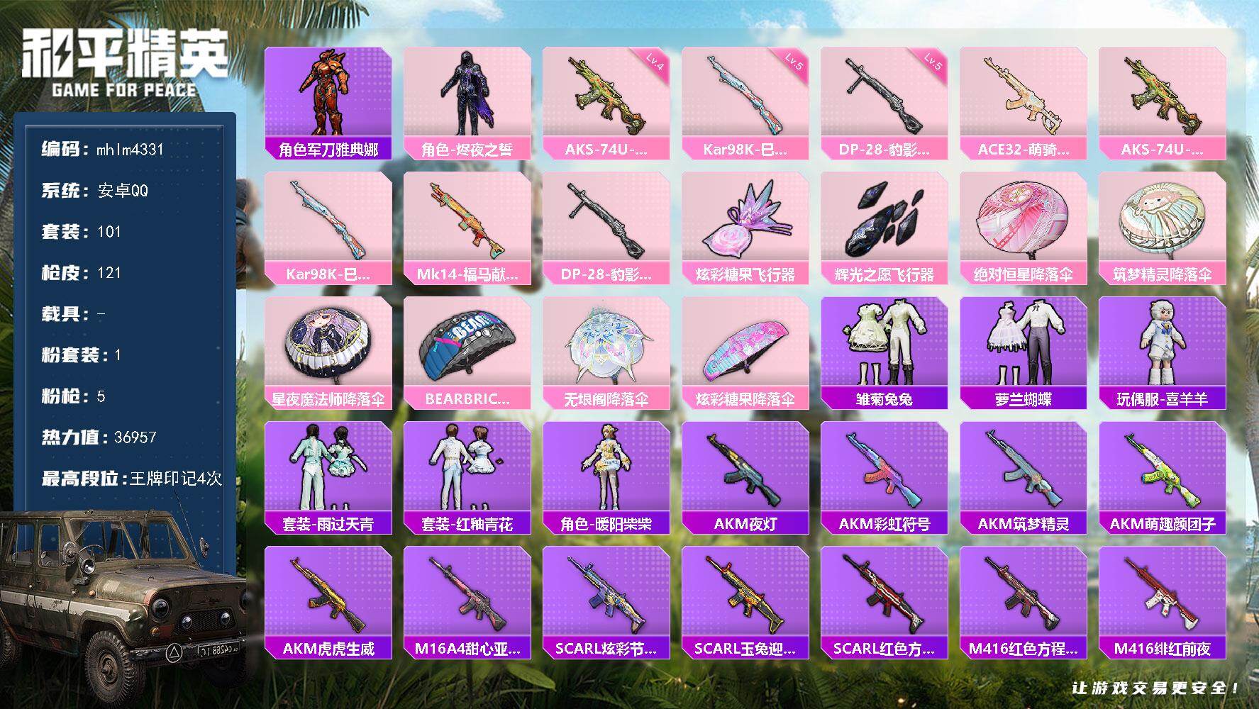 安卓 手Q-4粉装-4特效枪-0载具-1粉色飞行器-47509热力值-2王牌印