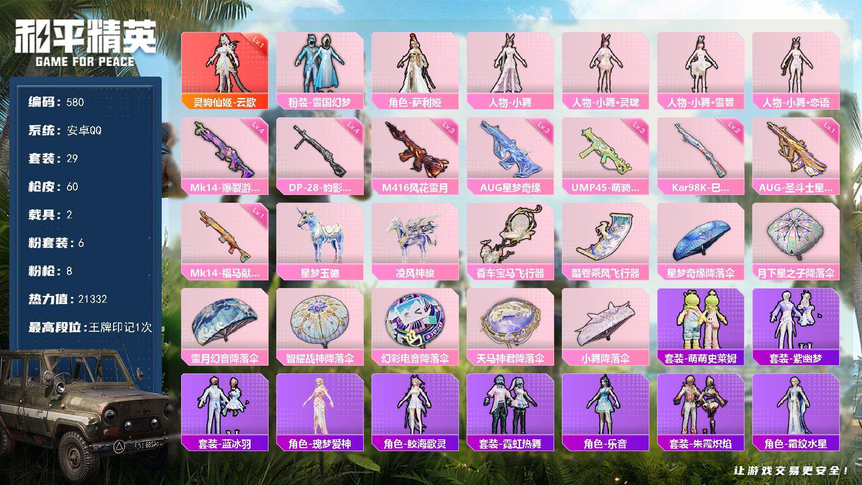 安卓 手Q-16粉装-13特效枪-2载具-7粉色飞行器-109997热力值-1