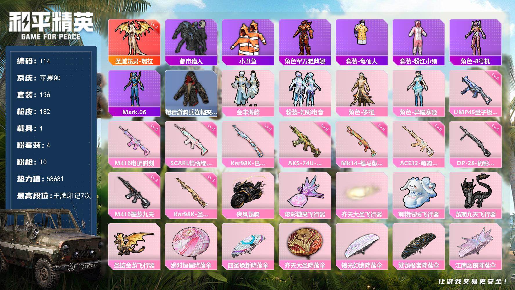 A999苹果 手Q-1神装-17粉装-10特效枪-1载具-4粉色飞行器-729