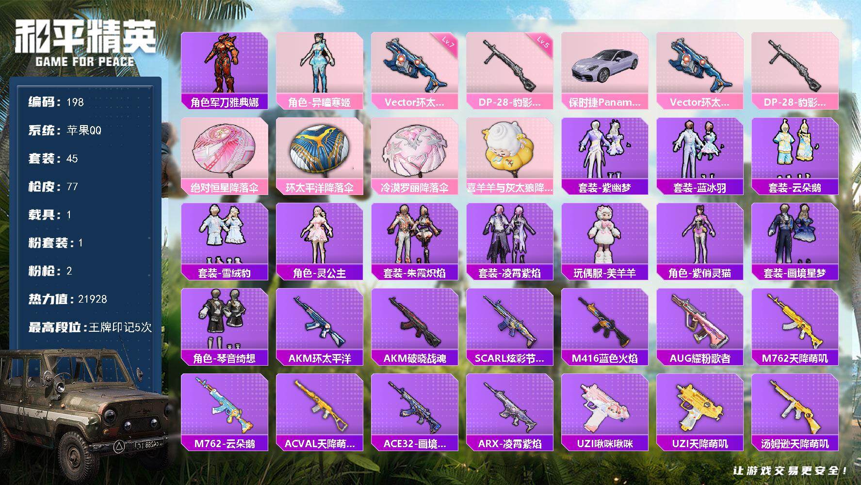 苹果 手Q-1粉装-2特效枪-1载具-1粉色飞行器-21928热力值-5王牌印