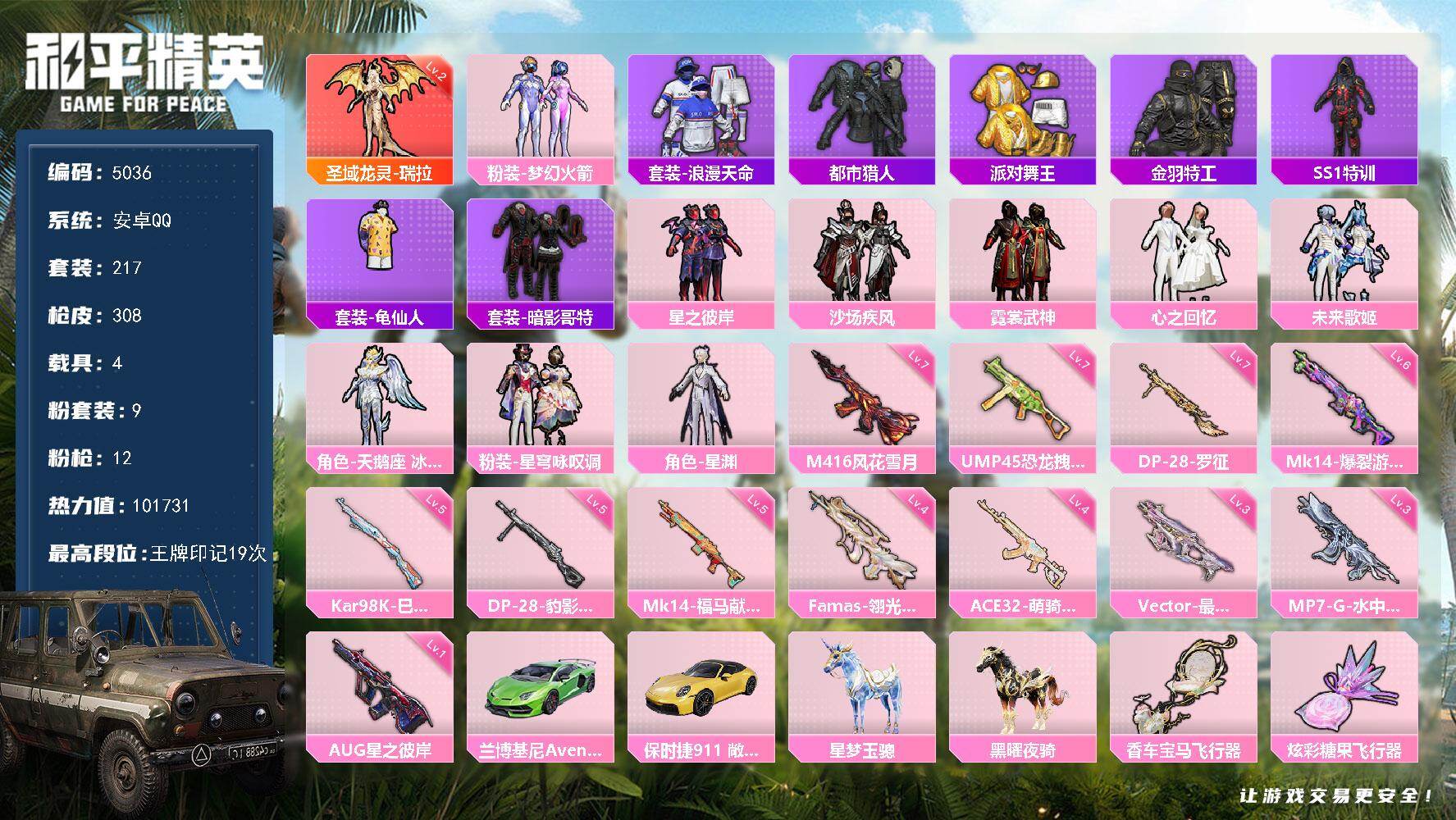 安卓 手Q-10粉装-6特效枪-3载具-3粉色飞行器-66603热力值-5王牌