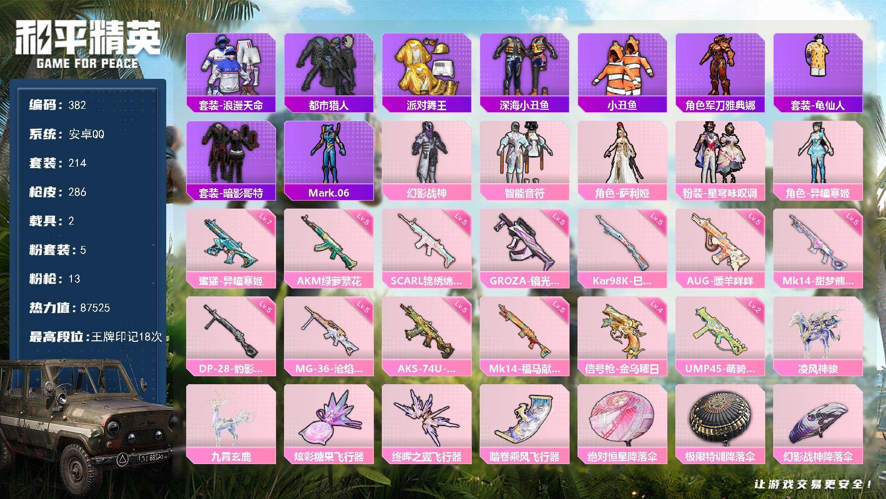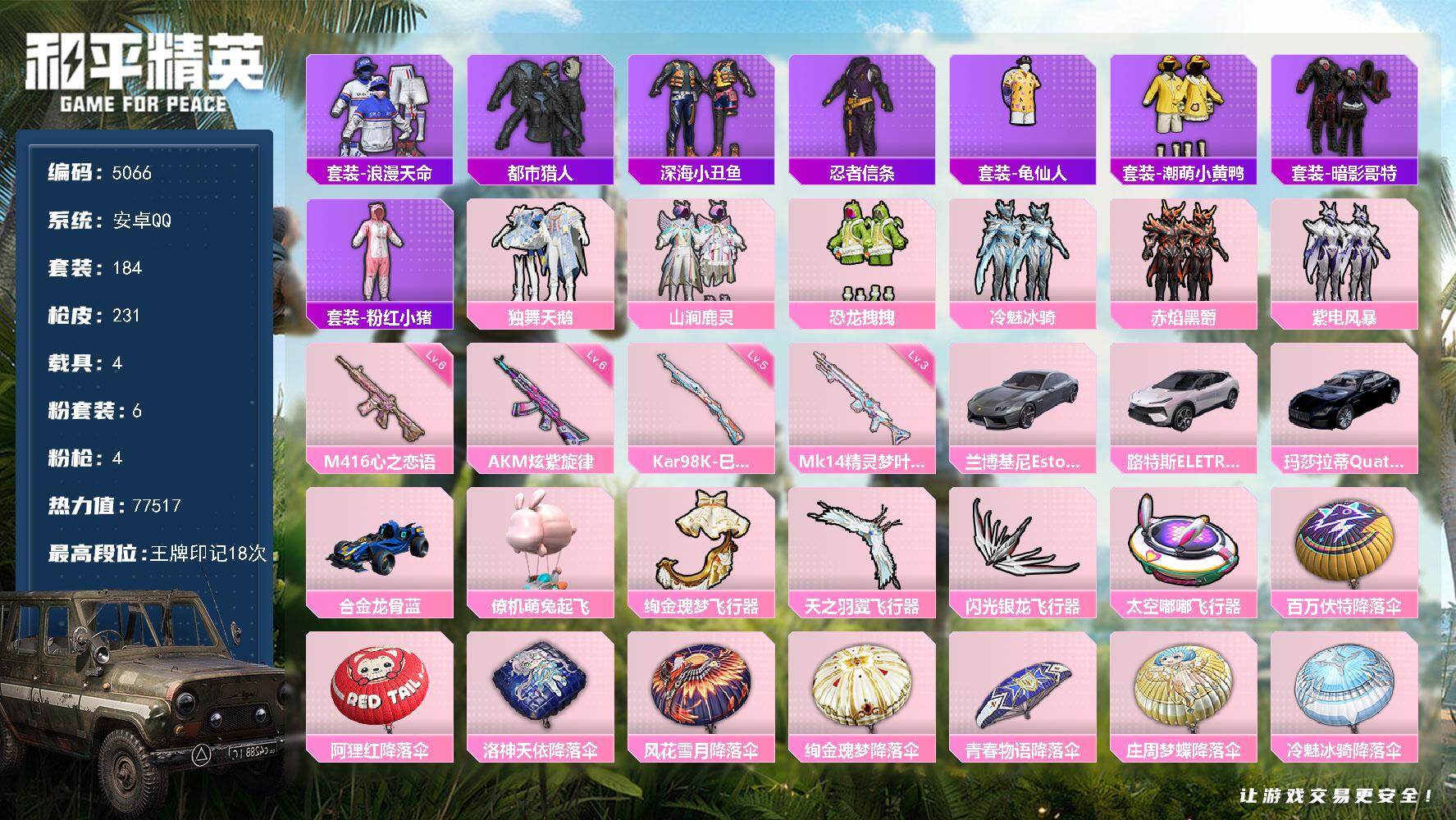 安卓 手Q-2粉装-3特效枪-0载具-0粉色飞行器-18141热力值-1王牌印