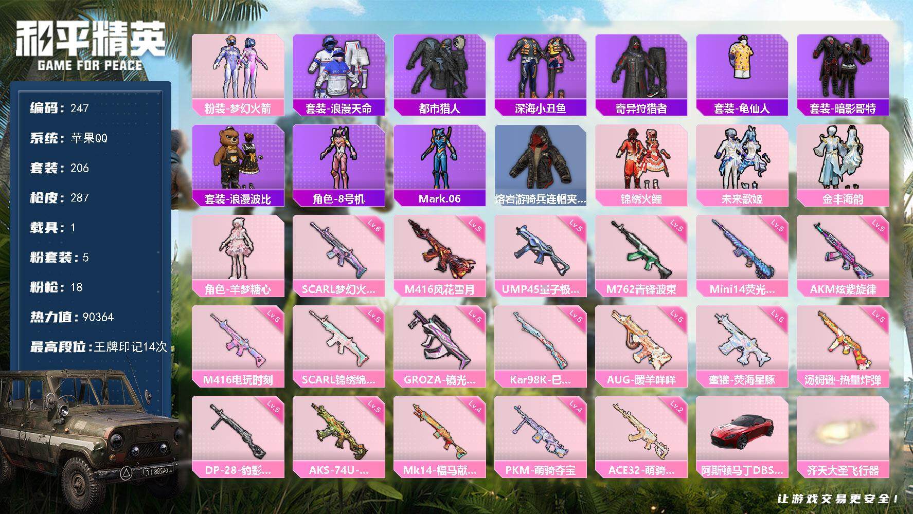 苹果 手Q-4粉装-6特效枪-0载具-0粉色飞行器-49718热力值-2王牌印