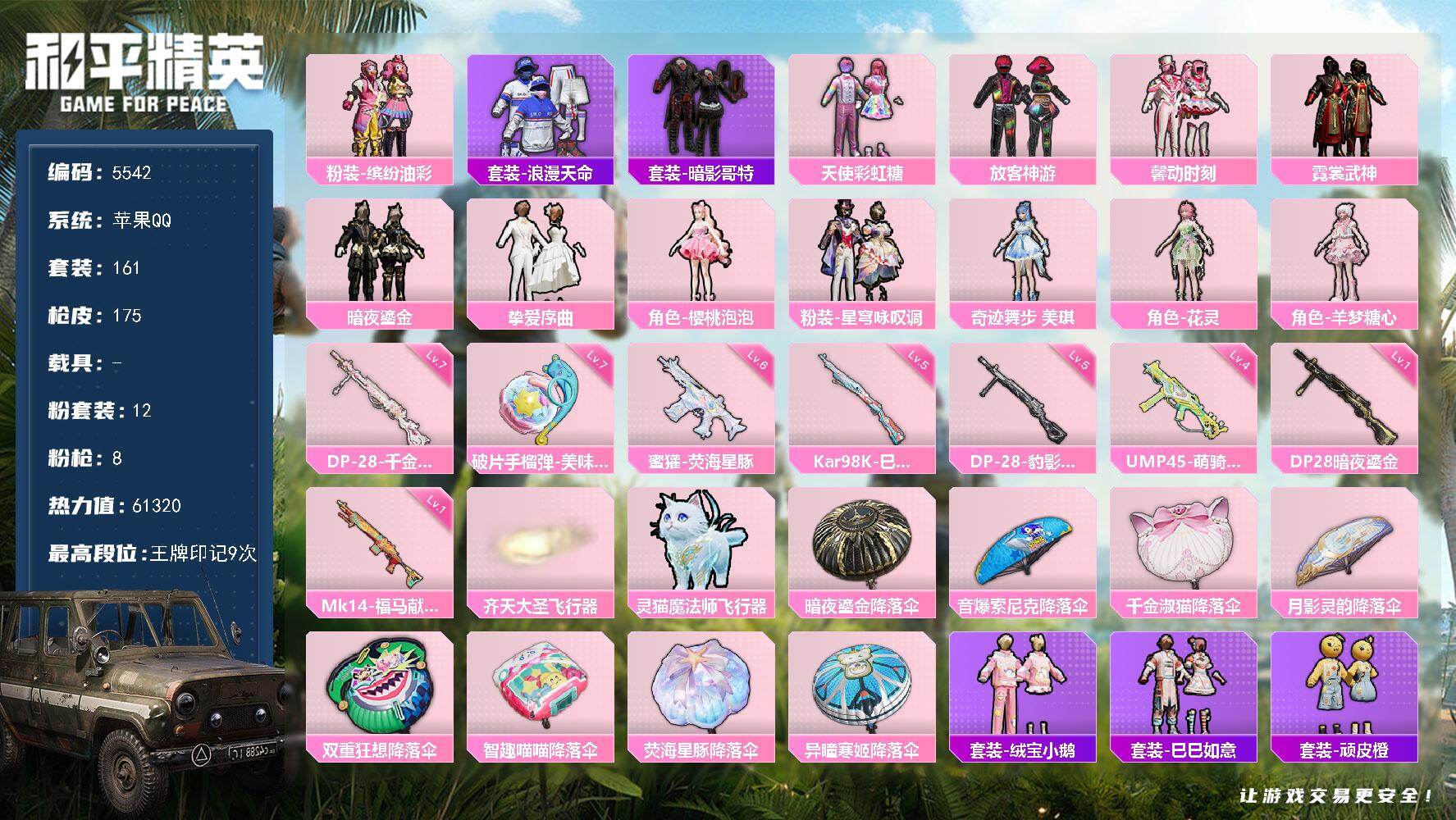 苹果 微信-1神装-6粉装-3特效枪-2载具-4粉色飞行器-37901热力值-