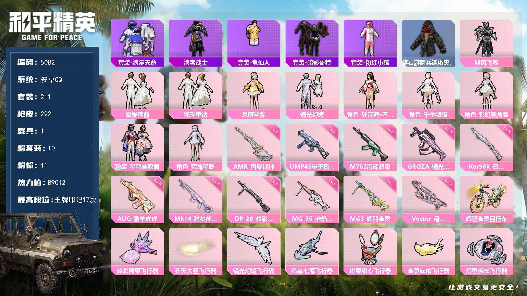 安卓 手Q-5粉装-11特效枪-2载具-3粉色飞行器-85898热力值-11王
