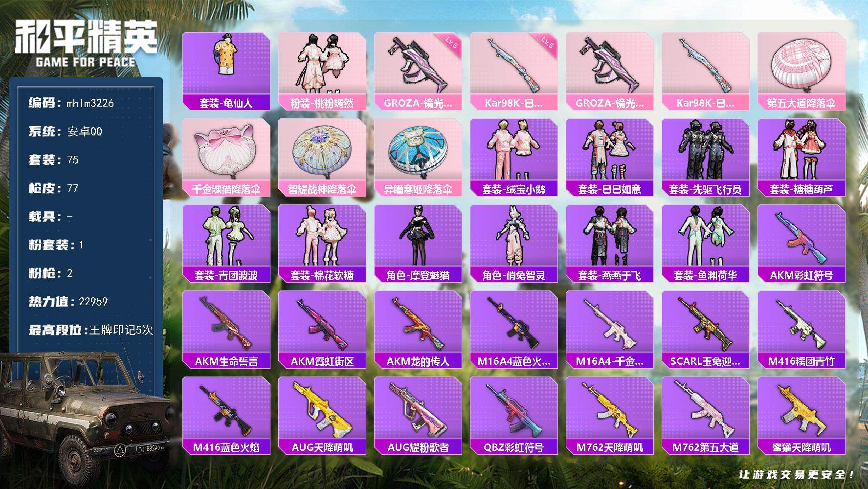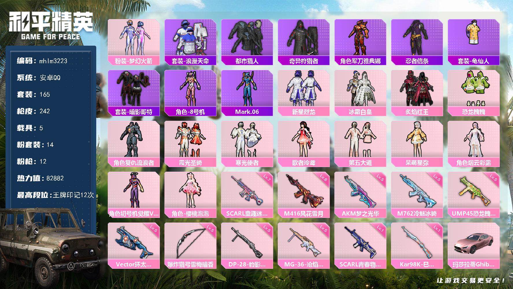 安卓【小号】 手Q-4粉装-3特效枪-1载具-2粉色飞行器-59285热力值-