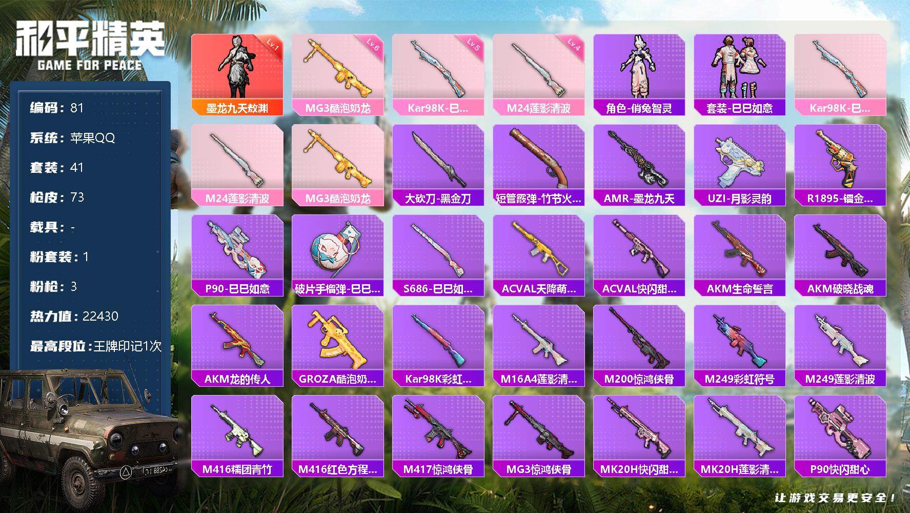 苹果 手Q-1粉装-2特效枪-1载具-1粉色飞行器-21928热力值-5王牌印