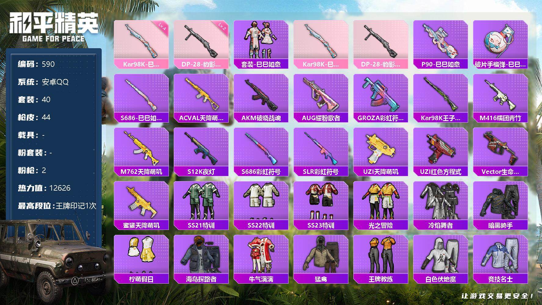 【精品小号 店家主推】:安卓 手Q-0粉装-2特效枪-0载具-12626热力值