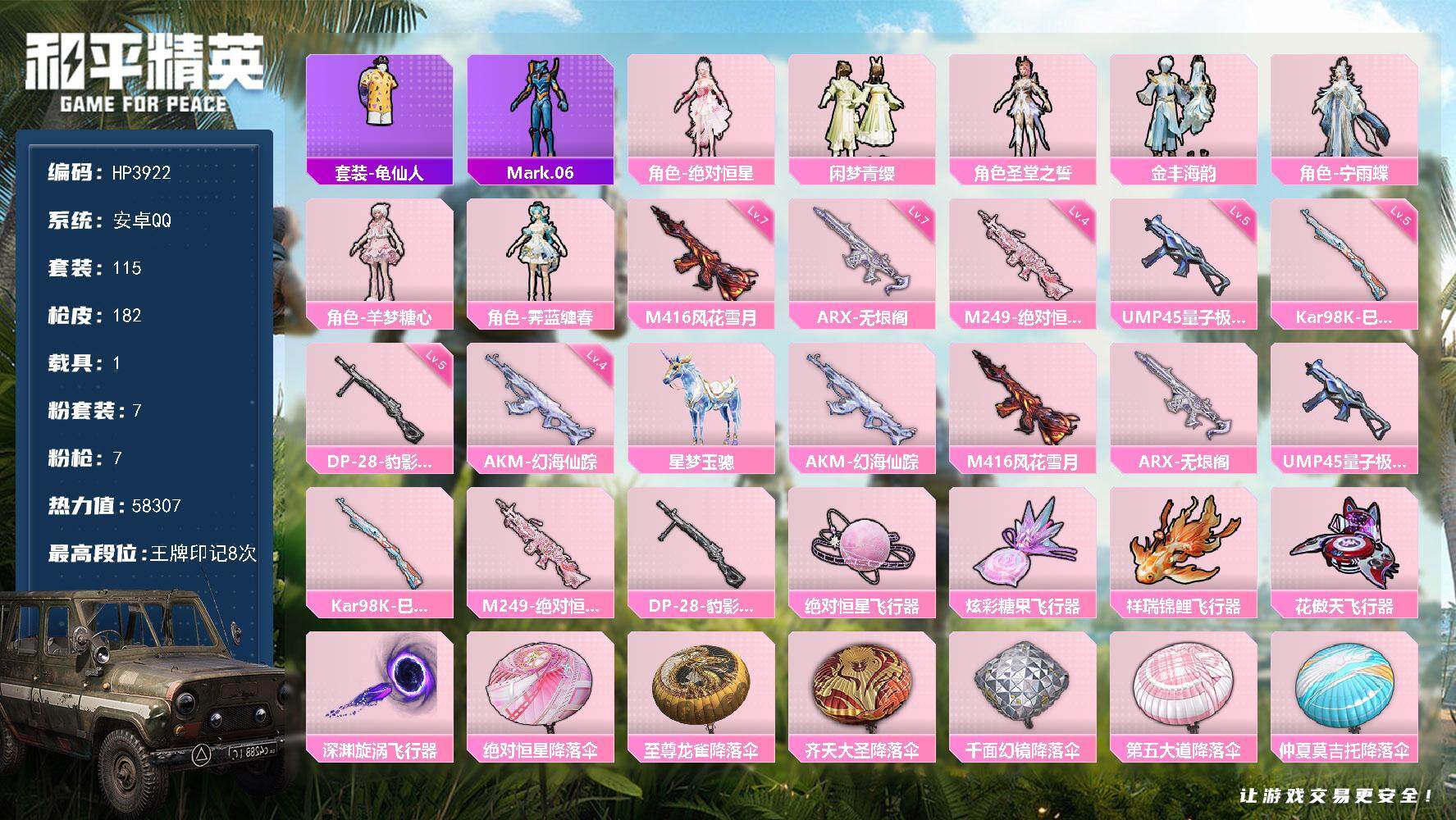 安卓 手Q-7粉装-7特效枪-1载具-5粉色飞行器-58307热力值-8王牌印