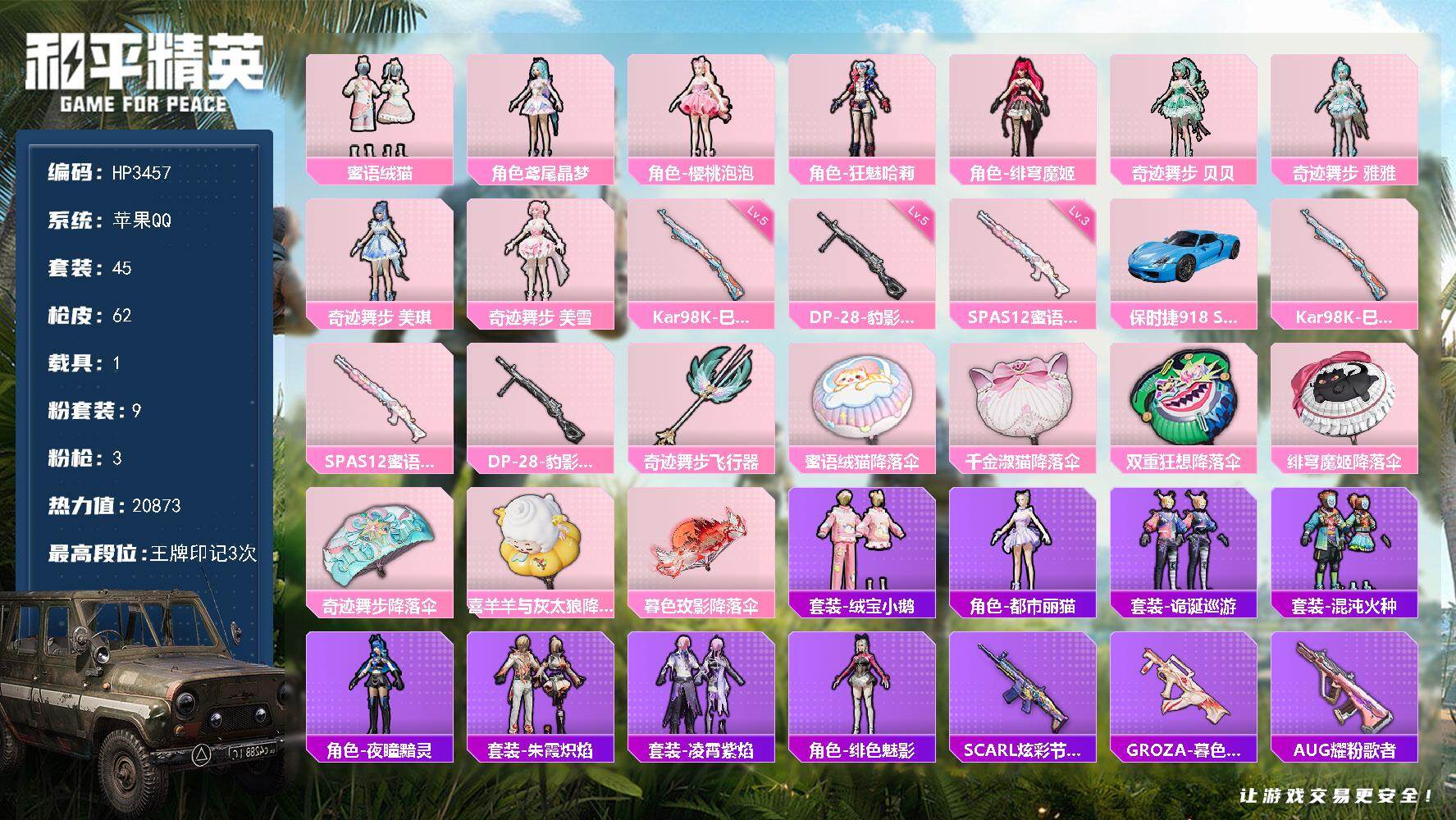 苹果 手Q-9粉装-3特效枪-1载具-2粉色飞行器-20873热力值-3王牌印