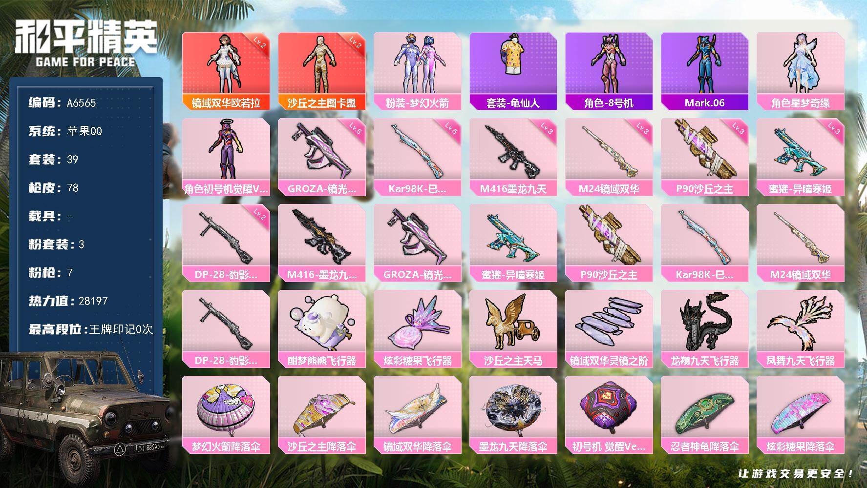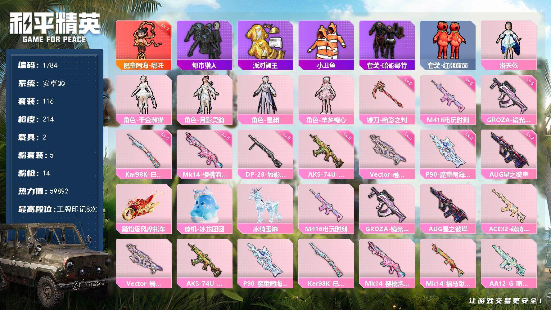安卓 手Q-6粉装-6特效枪-2载具-1粉色飞行器-51234热力值-3王牌印
