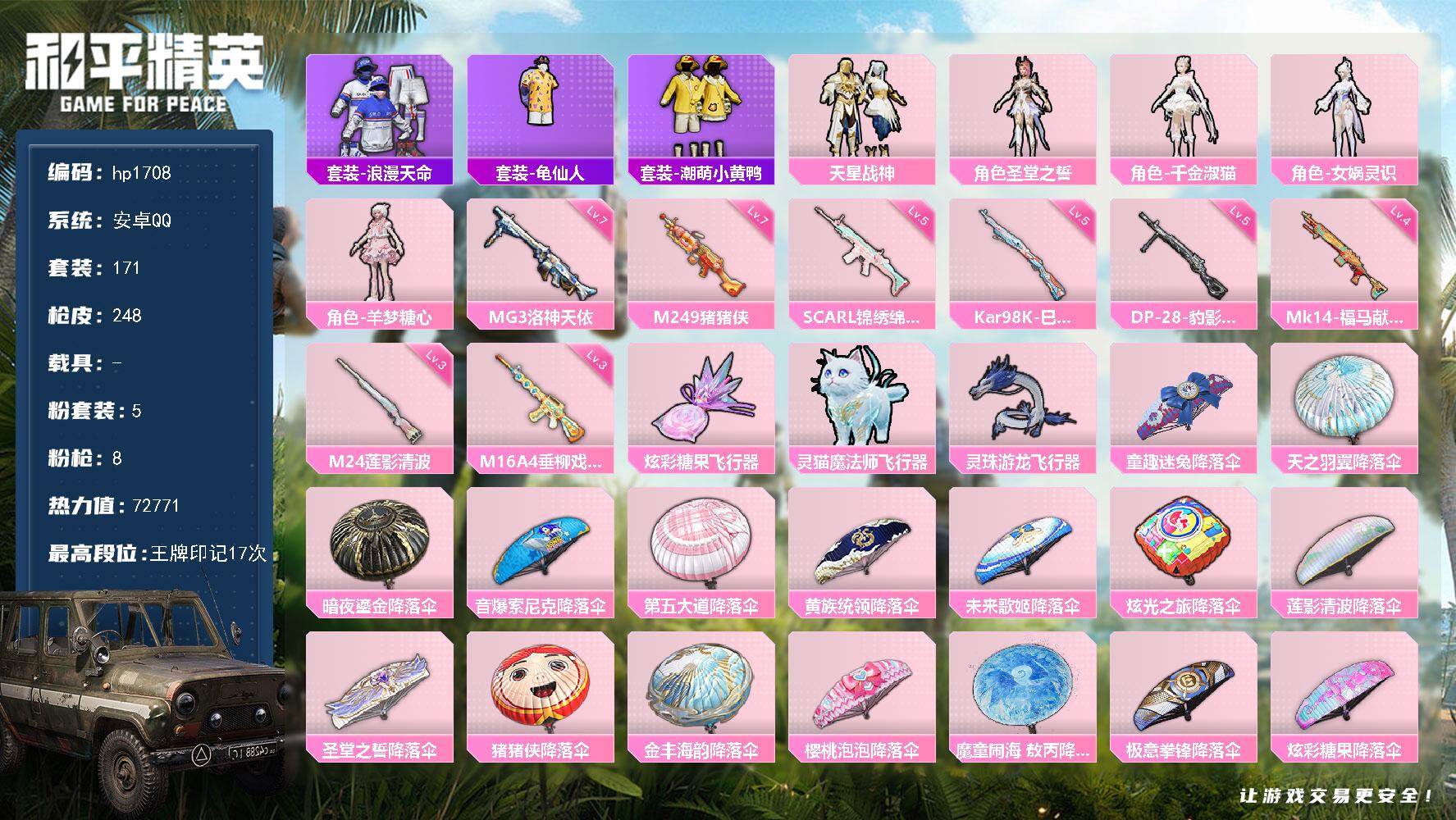 安卓 手Q-5粉装-8特效枪-0载具-3粉色飞行器-72771热力值-17王牌