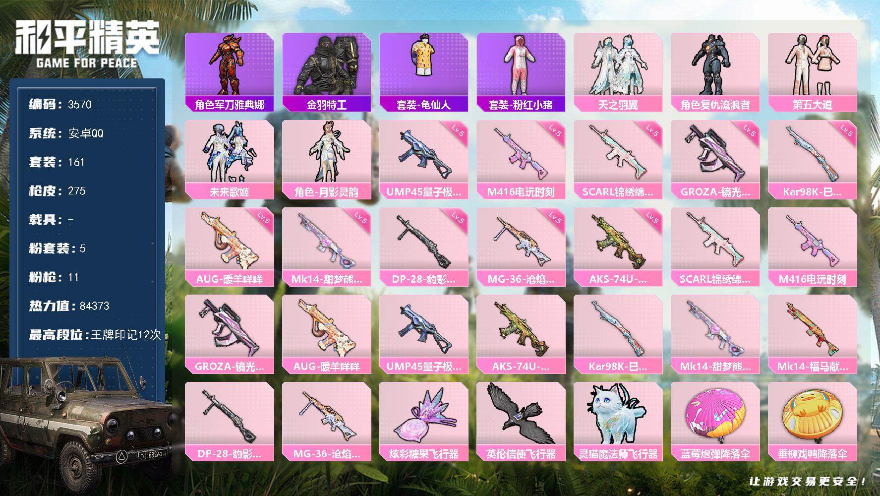 满级地铁 安卓 手Q-5粉装-11特效枪-0载具-3粉色飞行器-84373热力