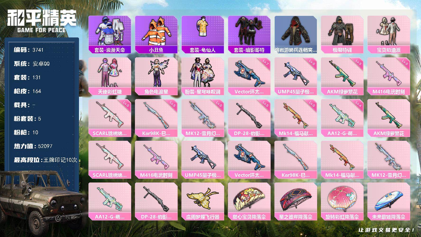 满级地铁 安卓 手Q-5粉装-10特效枪-0载具-1粉色飞行器-52097热力