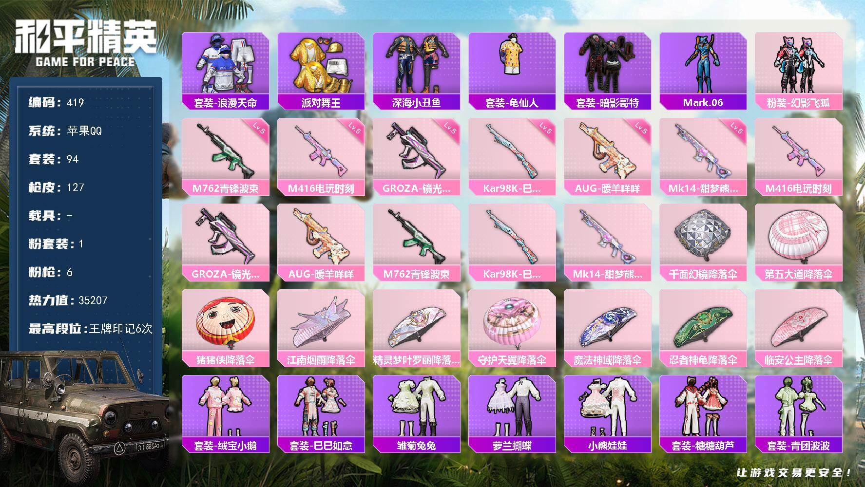 苹果 手Q-1粉装-6特效枪-0载具-0粉色飞行器-35207热力值-6王牌印