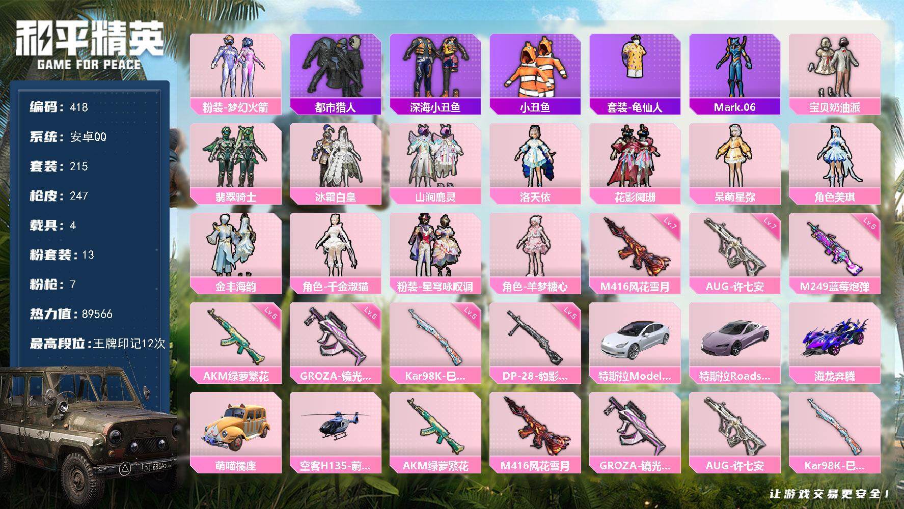 安卓 手Q-13粉装-7特效枪-4载具-3粉色飞行器-89566热力值-12王