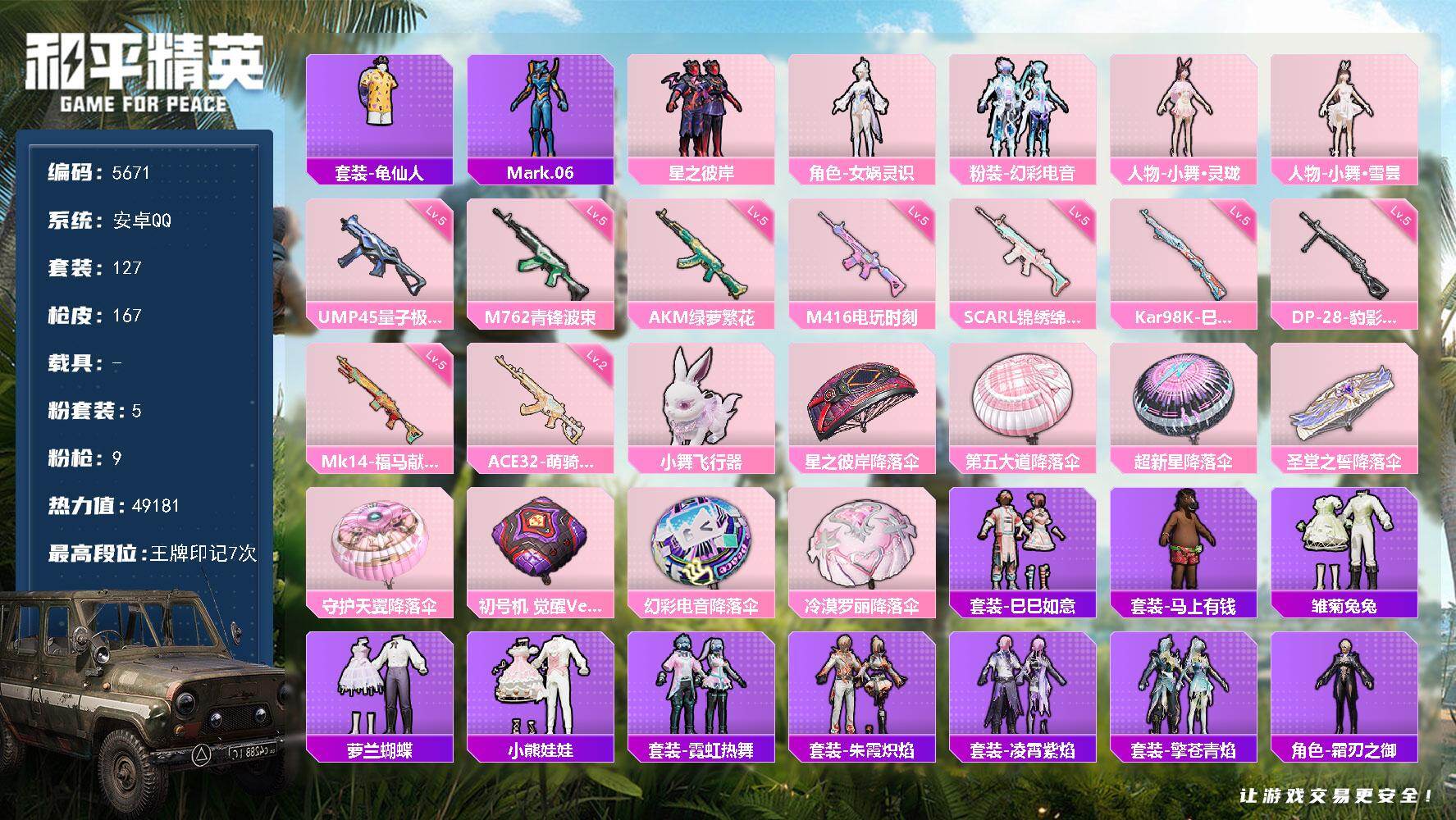 安卓 手Q-7粉装-6特效枪-0载具-2粉色飞行器-31248热力值-5王牌印