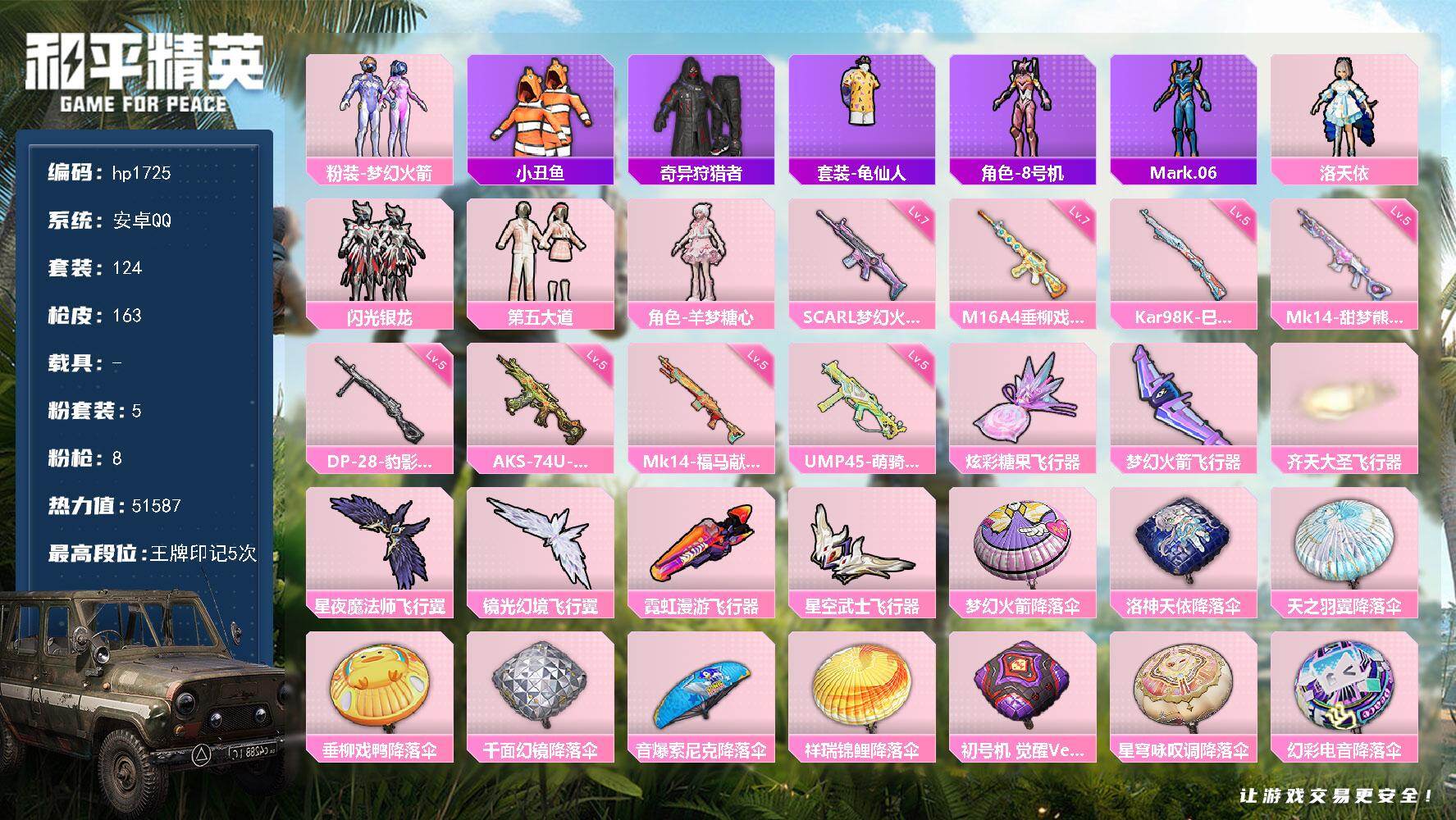 安卓 手Q-4粉装-5特效枪-1载具-2粉色飞行器-41086热力值-1王牌印