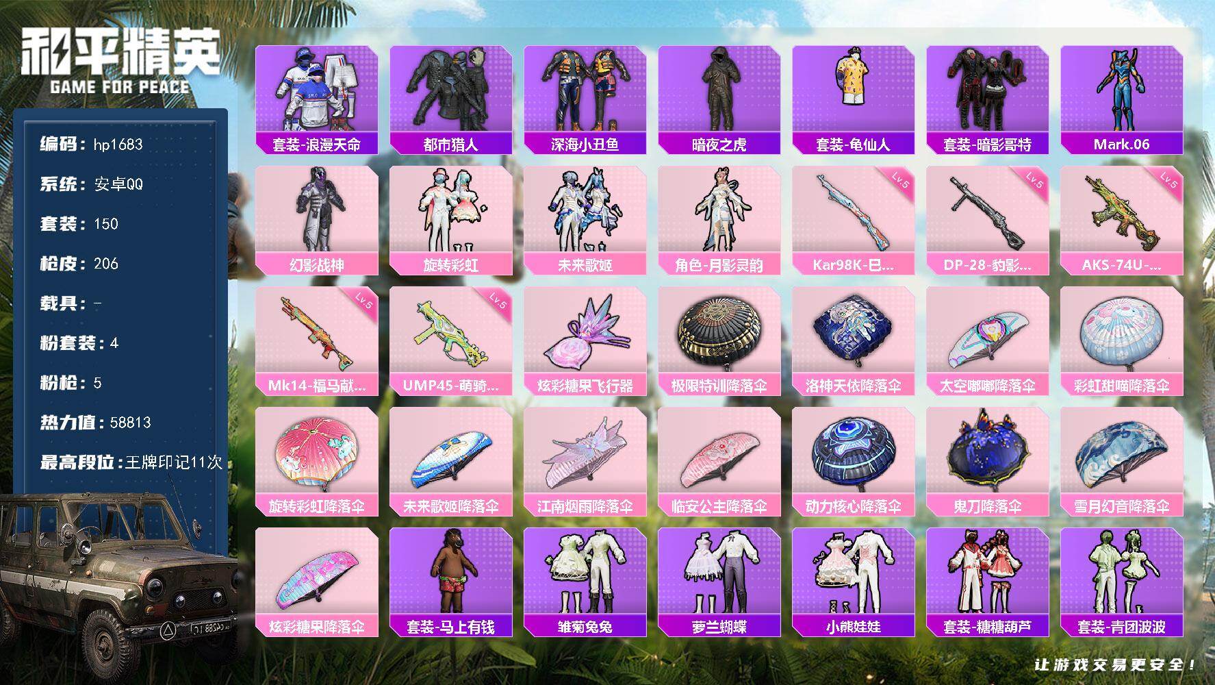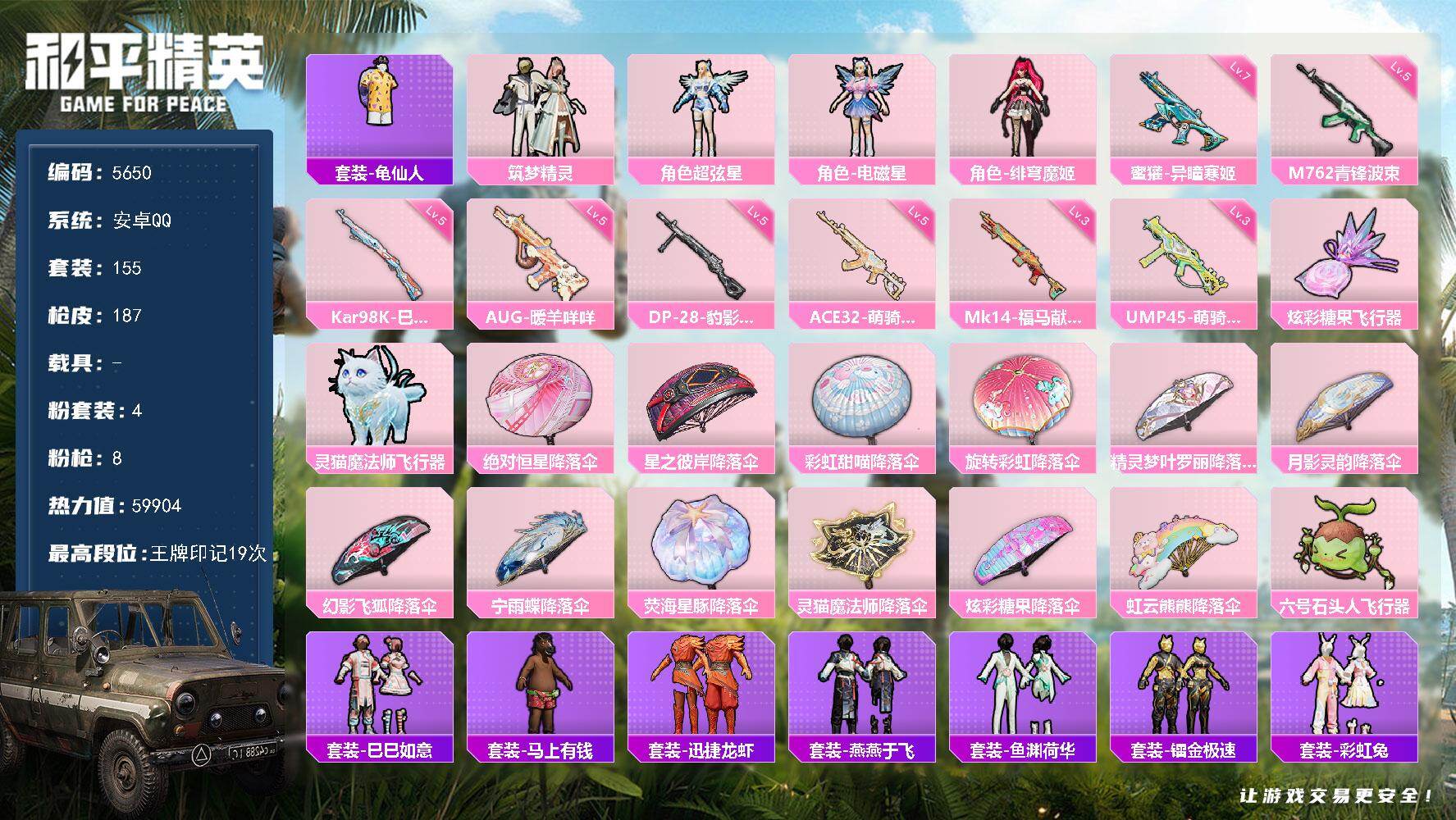 安卓 手Q-3粉装-9特效枪-0载具-1粉色飞行器-65378热力值-14王牌