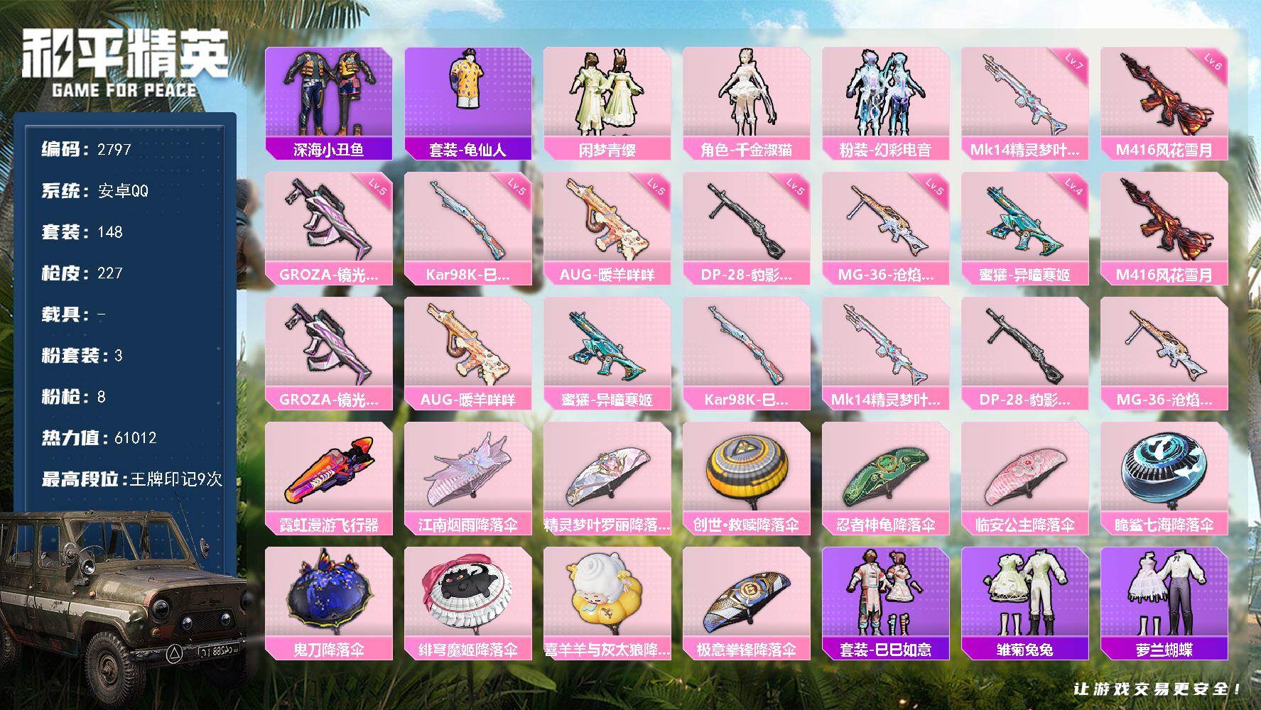 安卓 手Q-3粉装-8特效枪-0载具-3粉色飞行器-61012热力值-9王牌印