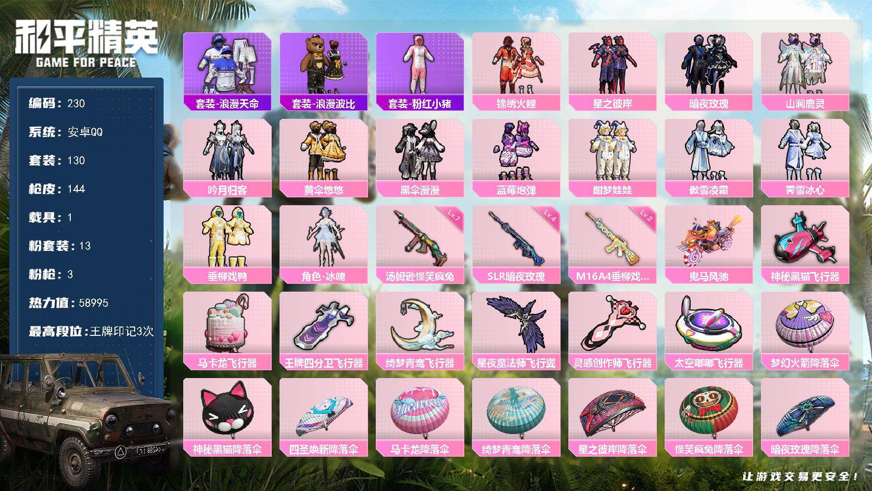 安卓 手Q-3粉装-5特效枪-0载具-0粉色飞行器-48526热力值-6王牌印