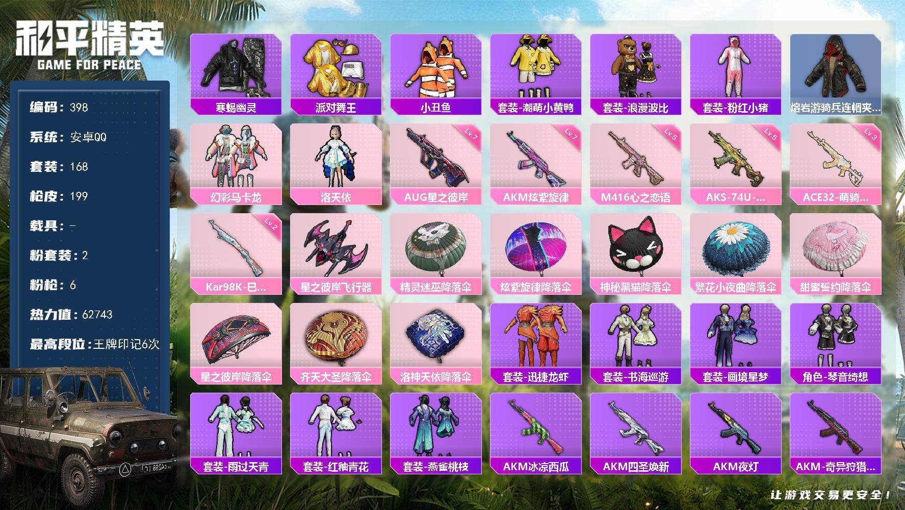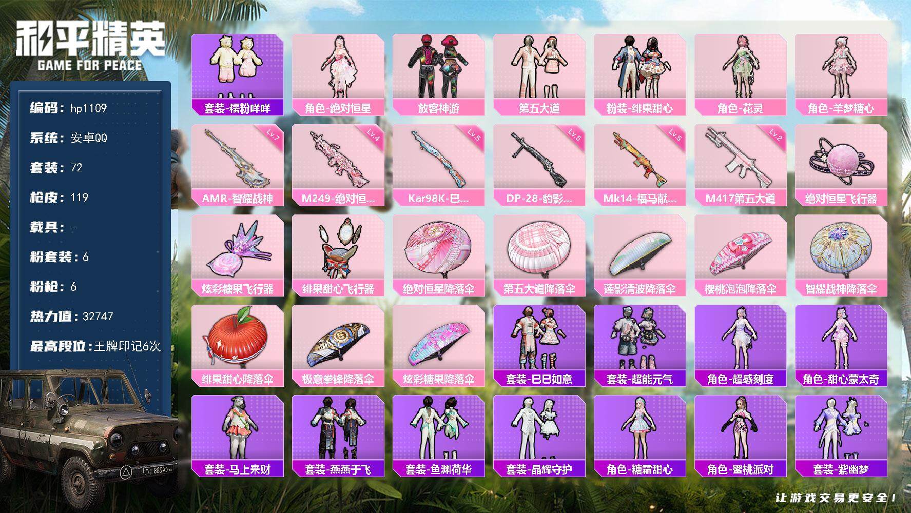 安卓 手Q-6粉装-6特效枪-0载具-3粉色飞行器-32747热力值-6王牌印
